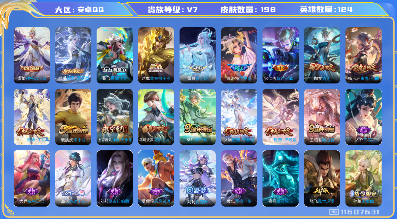 [11607631]V7 1典藏 1珍品传说 11传说 124英雄 198皮肤 可修改实名 优质装备:神鉴启示录,器灵·落星盏,黄金狮子座,超时空战士-狄仁杰,浮生妄,百相守梦(张飞),霜月吟 珍宝阁皮:妄想食味 限定皮:愿照·岁时盈(虞姬年限),愿照·山河定(司空震年限),愿照·千秋盛(女娲年限),映山客,鸣野蒿,太华(伽罗年限),李小龙,寅虎·心曲(虎婆),神器·万象笔,山海·玄木吟(马可年限) 史诗皮:器灵·浮梦炉,化蝶舞,星界战将,龙之律动,石田雨龙,茶境仙,破空之剑,蒙犽顽岩魄,海诺心动手记,夜落电台,乘龙·聚宝船(安琪拉年限),百相守梦-黄忠,织梦人,遇见神鹿,特工魅影,真我赫兹(百里守约),闲日渔趣,蒙恬荣光圣徽,冰冠公主,偶像歌手,白蛇,电玩·兔顽号,电玩·爆裂旋风,银翎春语,龙骑士(小龙虾),末日机甲-吕布,猫狗日记-孙策,猫狗日记-大乔,乱世虎臣,摇滚巨星,水果甜心,时之奇旅-安琪拉,德古拉伯爵,幽灵船长,鬼剑武藏,心灵战警,乐园奇幻夜,舞动绿茵,乘风破浪,逐浪之夏,金属风暴,鹰眼统帅,魅力维加斯,滕王阁序,千筹问战