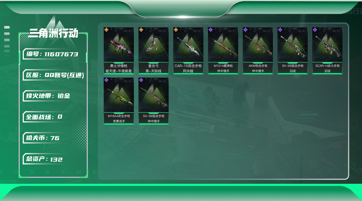 [11607673]总资产:132.7M 3传说枪械 哈夫币:76.480K 进阶安全箱(9.17到期) 可二次 可修改实名 烽火地带段位:铂金 全面战场段位:无段位 传说武器皮肤:CAR-15突击步枪-阿米娅,复合弓-黑-天际线,勇士冲锋枪-能天使-午夜邮差 史诗武器皮肤:M16A4突击步枪-竞赛选手,AKM突击步枪-林中猎手,M1014霰弹枪-林中猎手,SV-98狙击步枪-林中猎手,SV-98狙击步枪-囚徒,SCAR-H战斗步枪-囚徒