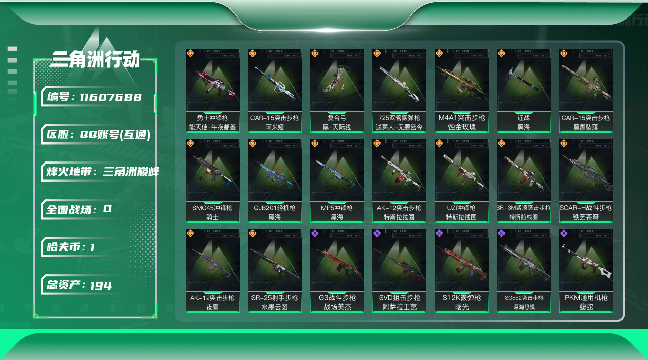 [11607688]总资产:194M 1干员外观 1近战传说 16传说枪械 哈夫币:1.682K 可二次 可修改实名 优质装备:近战-黑海,顶级安全箱(3x3) 烽火地带段位:三角洲巅峰 全面战场段位:列兵 传说武器皮肤:SR-25射手步枪-水墨云图,SCAR-H战斗步枪-铁艺苍穹,AK-12突击步枪-夜鹰,SMG45冲锋枪-骑士,CAR-15突击步枪-阿米娅,复合弓-黑-天际线,AK-12突击步枪-特斯拉线圈,SR-3M紧凑突击步枪-特斯拉线圈,UZI冲锋枪-特斯拉线圈,勇士冲锋枪-能天使-午夜邮差,725双管霰弹枪-送葬人-无题密令,MP5冲锋枪-黑海,QJB201轻机枪-黑海,M4A1突击步枪-蚀金玫瑰,CAR-15突击步枪-黑鹰坠落 史诗武器皮肤:QBZ95-1突击步枪-ACE,M4A1突击步枪-特勤执行,AUG突击步枪-特勤执行,Vector冲锋枪-红色彗星,PTR-32战斗步枪-ACE,SKS射手步枪-ACE,M700狙击步枪-蝮蛇,PKM通用机枪-蝮蛇,G3战斗步枪-战场英杰,Ash-12战斗步枪-守夜人,SVD狙击步枪-暗夜猎手,M16A4突击步枪-竞赛选手,PKM通用机枪-守夜人,AS Val突击步枪-尖端治疗,M700狙击步枪-守夜人,SG552突击步枪-尖端治疗,SR-25射手步枪-尖端治疗,PKM通用机枪-荒野求生,MP5冲锋枪-深海恐惧,SG552突击步枪-深海恐惧,AKM突击步枪-林中猎手,SR-3M紧凑突击步枪-荒野求生,M1014霰弹枪-林中猎手,PTR-32突击步枪-英雄,SVD狙击步枪-荒野求生,AS Val突击步枪-典狱官,M250通用机枪-囚徒,SV-98狙击步枪-囚徒,SCAR-H战斗步枪-囚徒,腾龙突击步枪-无垢,MP7冲锋枪-无垢,PSG-1射手步枪-无垢,M14射手步枪-黑鹰坠落,QBZ95-1突击步枪-曙光,沙漠之鹰-曙光,Vector冲锋枪-阿萨拉文明,SVD狙击步枪-阿萨拉工艺,S12K霰弹枪-曙光 干员外观:红狼-蚀金玫瑰