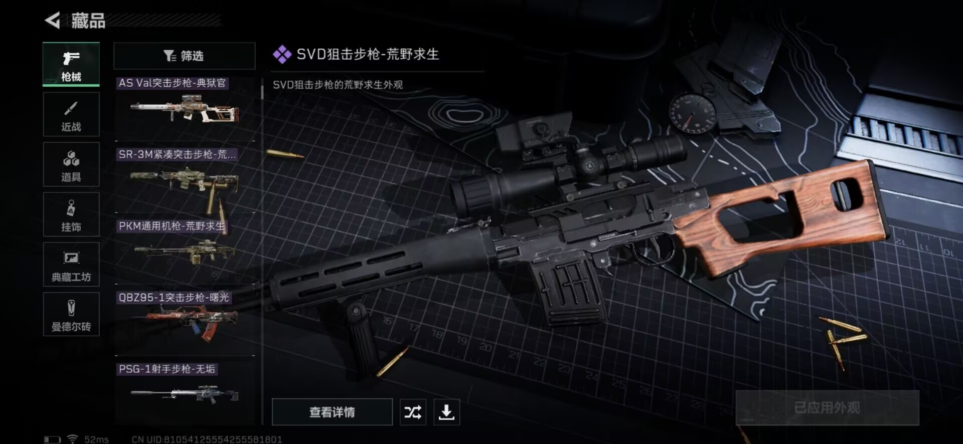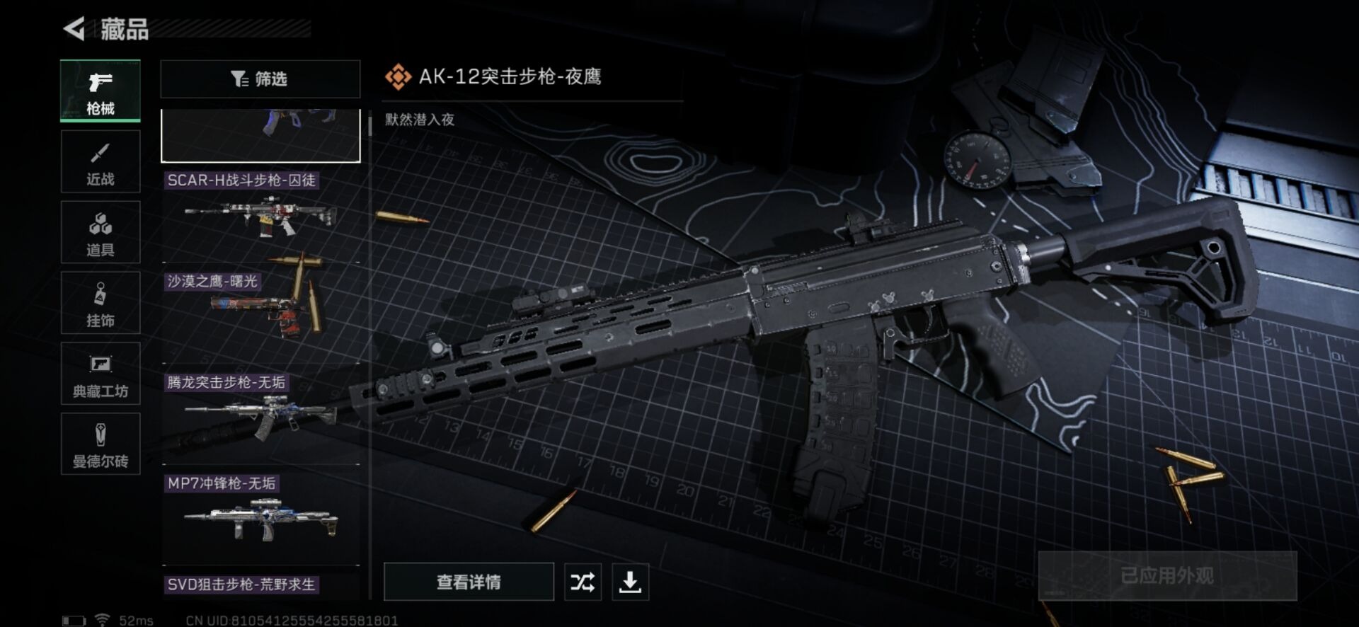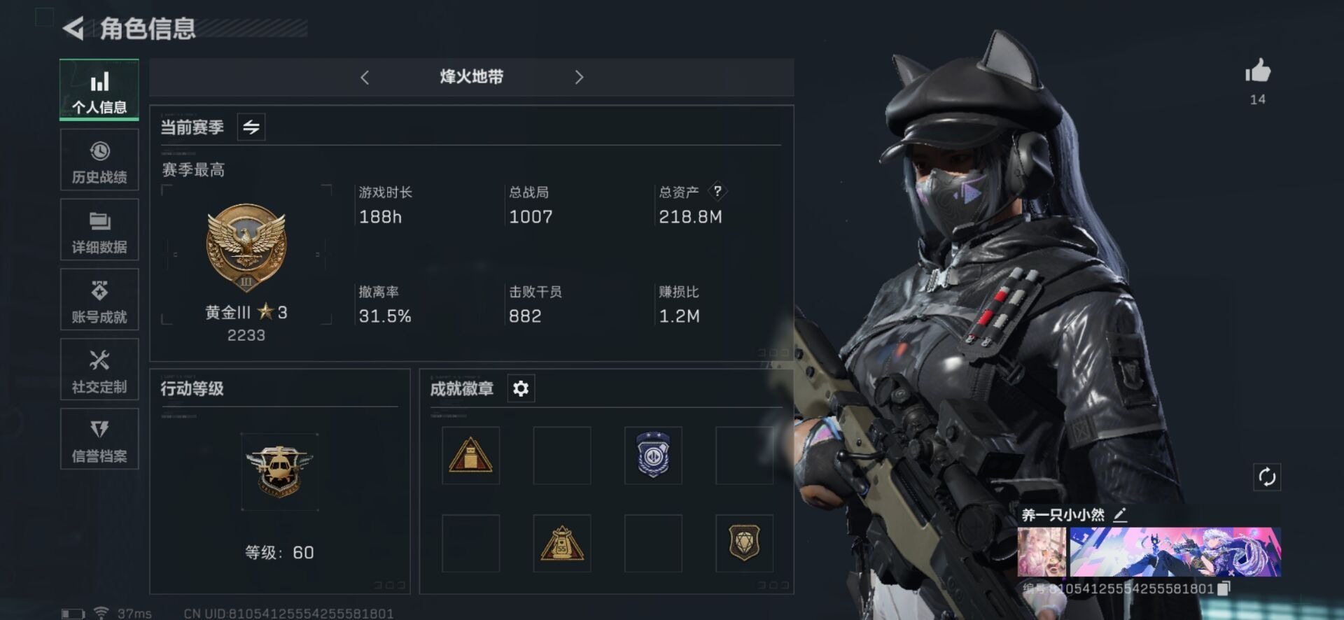 [11607693]总资产:218.8M 1近战传说 11传说枪械 哈夫币:29.122K 可二次 可修改实名 优质装备:近战-北极星,顶级安全箱(3x3) 烽火地带段位:黄金 全面战场段位:列兵 传说武器皮肤:AK-12突击步枪-夜鹰,M4A1突击步枪-阿米娅,复合弓-黑-天际线,AWM狙击步枪-捞点薯条,QCQ171冲锋枪-北极星,腾龙突击步枪-捞点薯条,93R-捞点薯条,勇士冲锋枪-能天使-午夜邮差,725双管霰弹枪-送葬人-无题密令,K437突击步枪-北极星 史诗武器皮肤:Ash-12战斗步枪-守夜人,PKM通用机枪-守夜人,AS Val突击步枪-尖端治疗,M700狙击步枪-守夜人,SG552突击步枪-尖端治疗,SR-25射手步枪-尖端治疗,PKM通用机枪-荒野求生,AKM突击步枪-林中猎手,SR-3M紧凑突击步枪-荒野求生,M1014霰弹枪-林中猎手,SV-98狙击步枪-林中猎手,PTR-32突击步枪-英雄,SVD狙击步枪-荒野求生,AS Val突击步枪-典狱官,SCAR-H战斗步枪-囚徒,腾龙突击步枪-无垢,MP7冲锋枪-无垢,PSG-1射手步枪-无垢,QBZ95-1突击步枪-曙光,沙漠之鹰-曙光