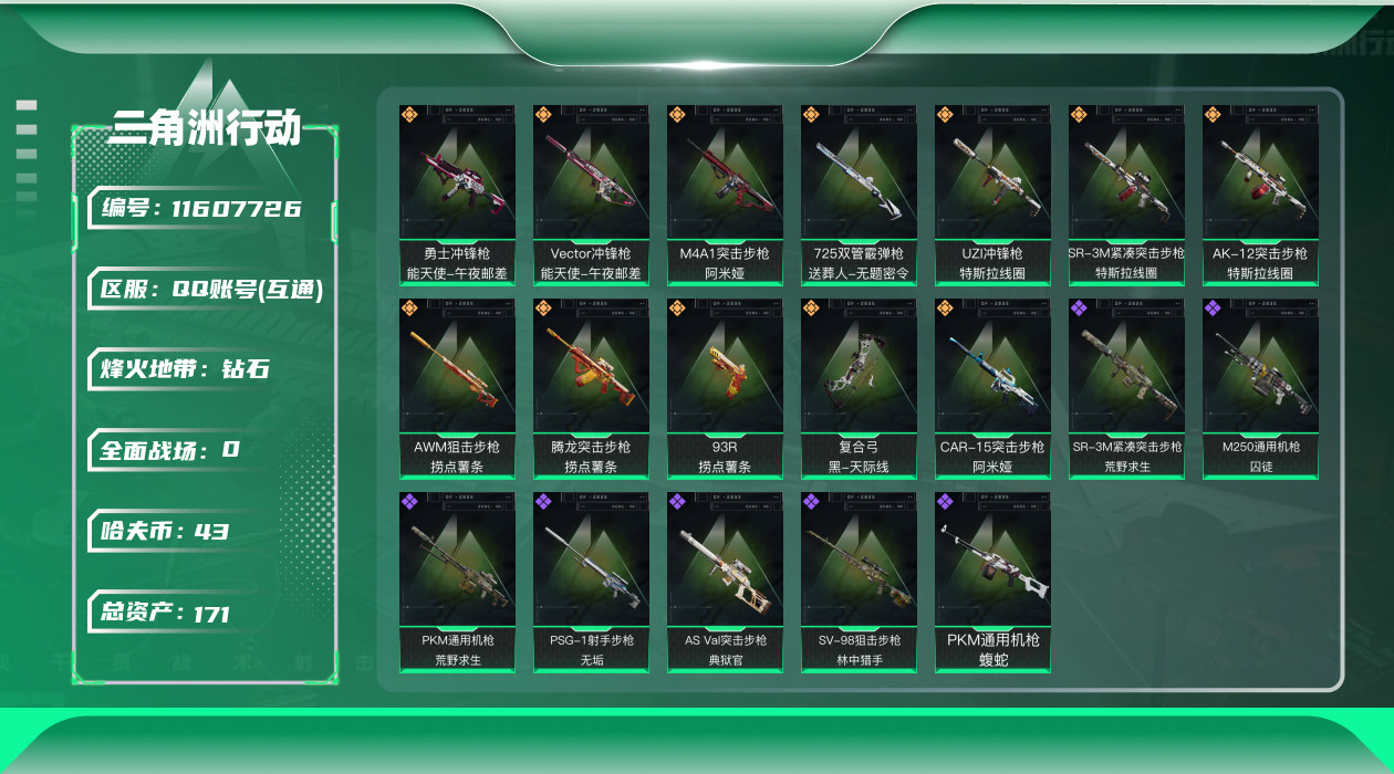 [11607726]总资产:171.6M 12传说枪械 哈夫币:43.086K 高级安全箱(2×3)9.15号到期 可二次 可修改实名 烽火地带段位:钻石 全面战场段位:列兵 传说武器皮肤:M4A1突击步枪-阿米娅,CAR-15突击步枪-阿米娅,复合弓-黑-天际线,AWM狙击步枪-捞点薯条,腾龙突击步枪-捞点薯条,93R-捞点薯条,AK-12突击步枪-特斯拉线圈,SR-3M紧凑突击步枪-特斯拉线圈,UZI冲锋枪-特斯拉线圈,勇士冲锋枪-能天使-午夜邮差,725双管霰弹枪-送葬人-无题密令,Vector冲锋枪-能天使-午夜邮差 史诗武器皮肤:PKM通用机枪-蝮蛇,PKM通用机枪-荒野求生,SR-3M紧凑突击步枪-荒野求生,SV-98狙击步枪-林中猎手,AS Val突击步枪-典狱官,M250通用机枪-囚徒,PSG-1射手步枪-无垢