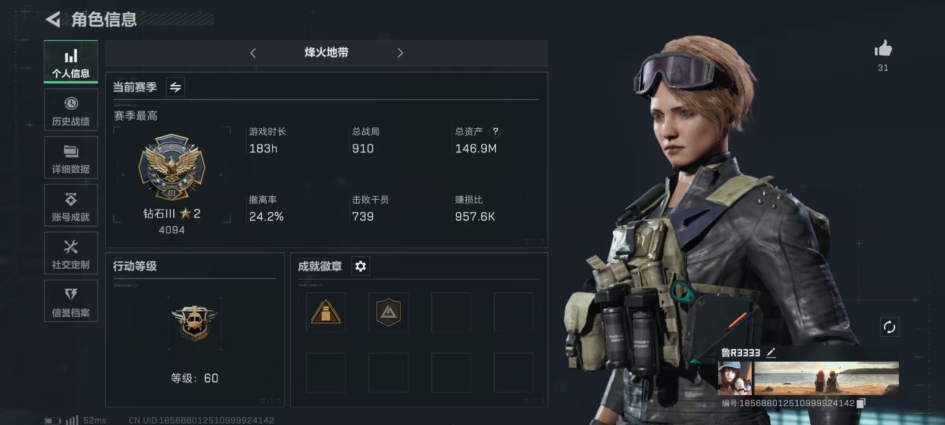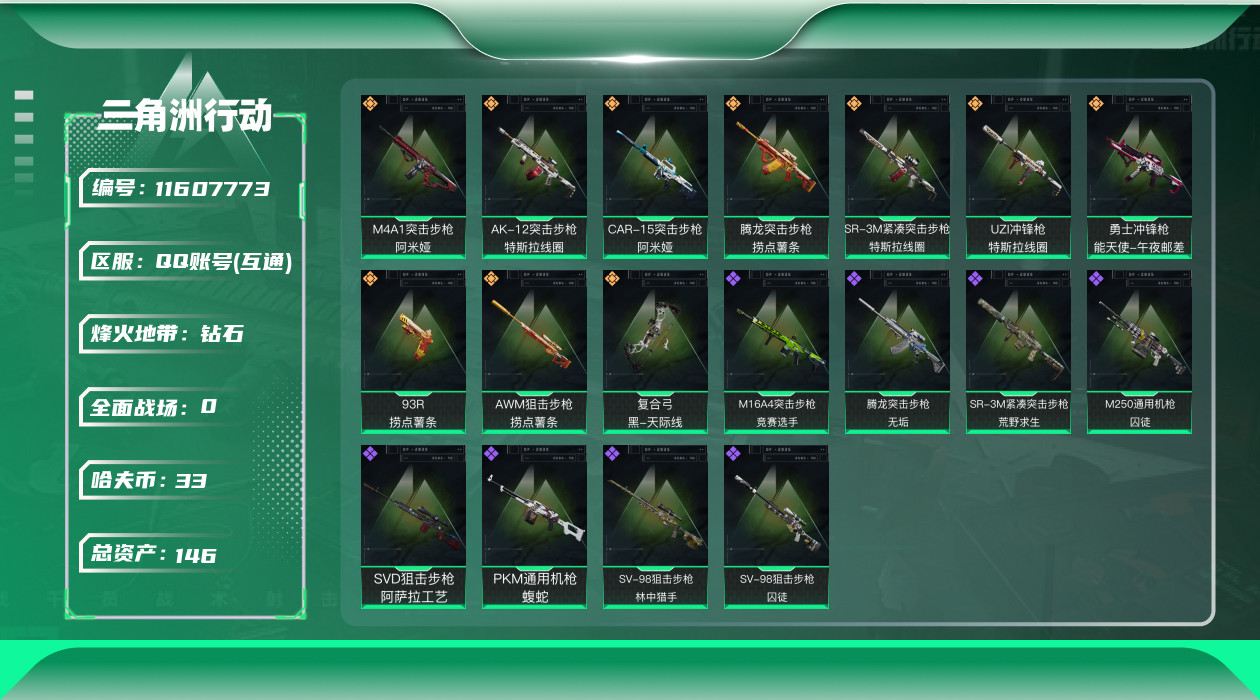 [11607773]总资产:146.9M 10传说枪械 哈夫币:33.522K 可二次 可修改实名 烽火地带段位:钻石 全面战场段位:军士长 传说武器皮肤:93R-捞点薯条,AWM狙击步枪-捞点薯条,腾龙突击步枪-捞点薯条,AK-12突击步枪-特斯拉线圈,CAR-15突击步枪-阿米娅,SR-3M紧凑突击步枪-特斯拉线圈,UZI冲锋枪-特斯拉线圈,勇士冲锋枪-能天使-午夜邮差,复合弓-黑-天际线,M4A1突击步枪-阿米娅 史诗武器皮肤:PKM通用机枪-蝮蛇,M16A4突击步枪-竞赛选手,SR-3M紧凑突击步枪-荒野求生,SV-98狙击步枪-林中猎手,M250通用机枪-囚徒,SV-98狙击步枪-囚徒,腾龙突击步枪-无垢,SVD狙击步枪-阿萨拉工艺