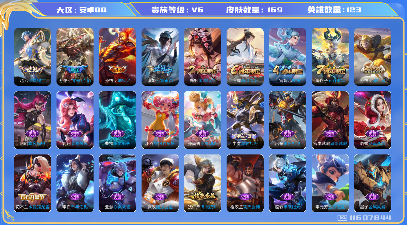 [11607844]V6 4传说 123英雄 169皮肤 可修改实名 优质装备:云霓雀翎,地狱火,零号·赤焰,淬星耀世 珍宝阁皮:蔷薇恋人 限定皮:高山流水,五谷丰年,游园惊梦,梁祝,孙行者 史诗皮:星界战将,千年之狐,偶像歌手,暗夜猫娘,末日机甲-吕布,节奏热浪,女仆咖啡,摇滚巨星,水果甜心,功夫厨神,幽灵船长,鬼剑武藏,心灵战警,缤纷独角兽,逐浪之夏,水晶猎龙者,金属风暴,圣诞恋歌,鹰眼统帅,魅力维加斯,未来纪元-赵云