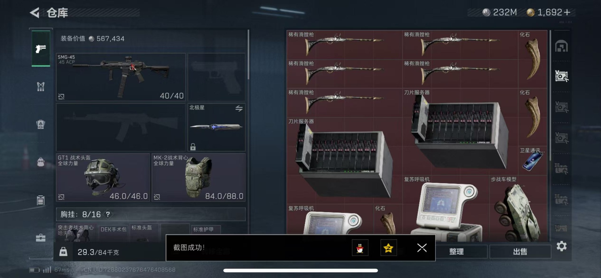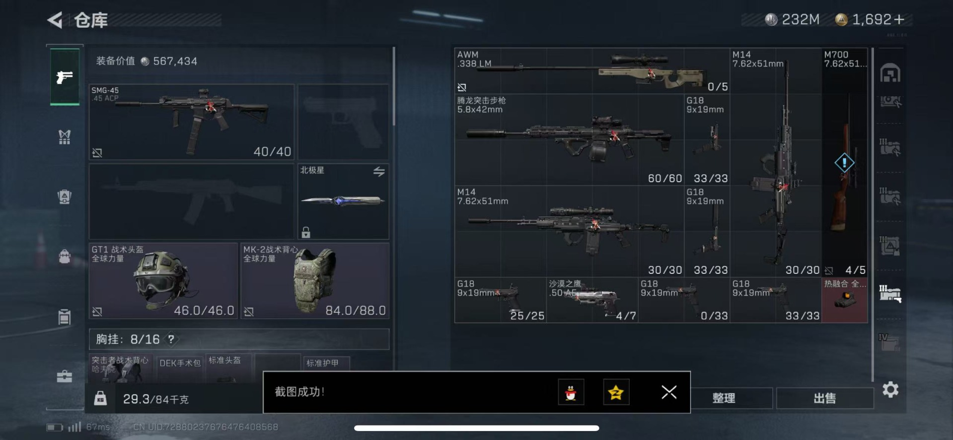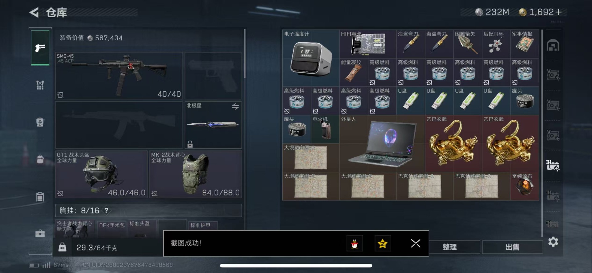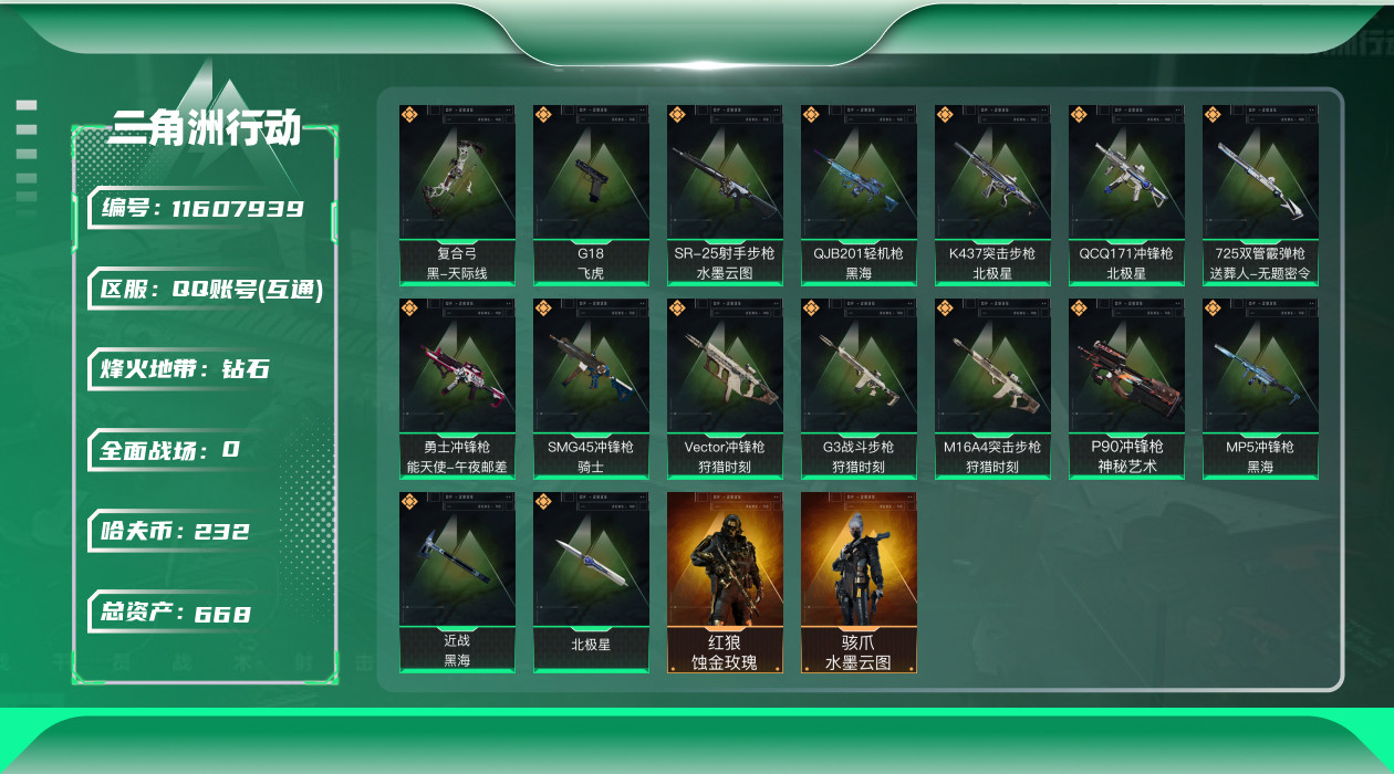 [11607939]总资产:668.2M 2干员外观 2近战传说 16传说枪械 哈夫币:232K 高级安全箱(2×3)9.15号到期 可二次 可修改实名 优质装备:近战-黑海,近战-北极星 烽火地带段位:钻石 全面战场段位:上等兵 传说武器皮肤:SR-25射手步枪-水墨云图,G18-飞虎,SMG45冲锋枪-骑士,M16A4突击步枪-狩猎时刻,复合弓-黑-天际线,Vector冲锋枪-狩猎时刻,G3战斗步枪-狩猎时刻,QCQ171冲锋枪-北极星,勇士冲锋枪-能天使-午夜邮差,725双管霰弹枪-送葬人-无题密令,K437突击步枪-北极星,MP5冲锋枪-黑海,QJB201轻机枪-黑海,P90冲锋枪-神秘艺术 干员外观:红狼-蚀金玫瑰,骇爪-水墨云图