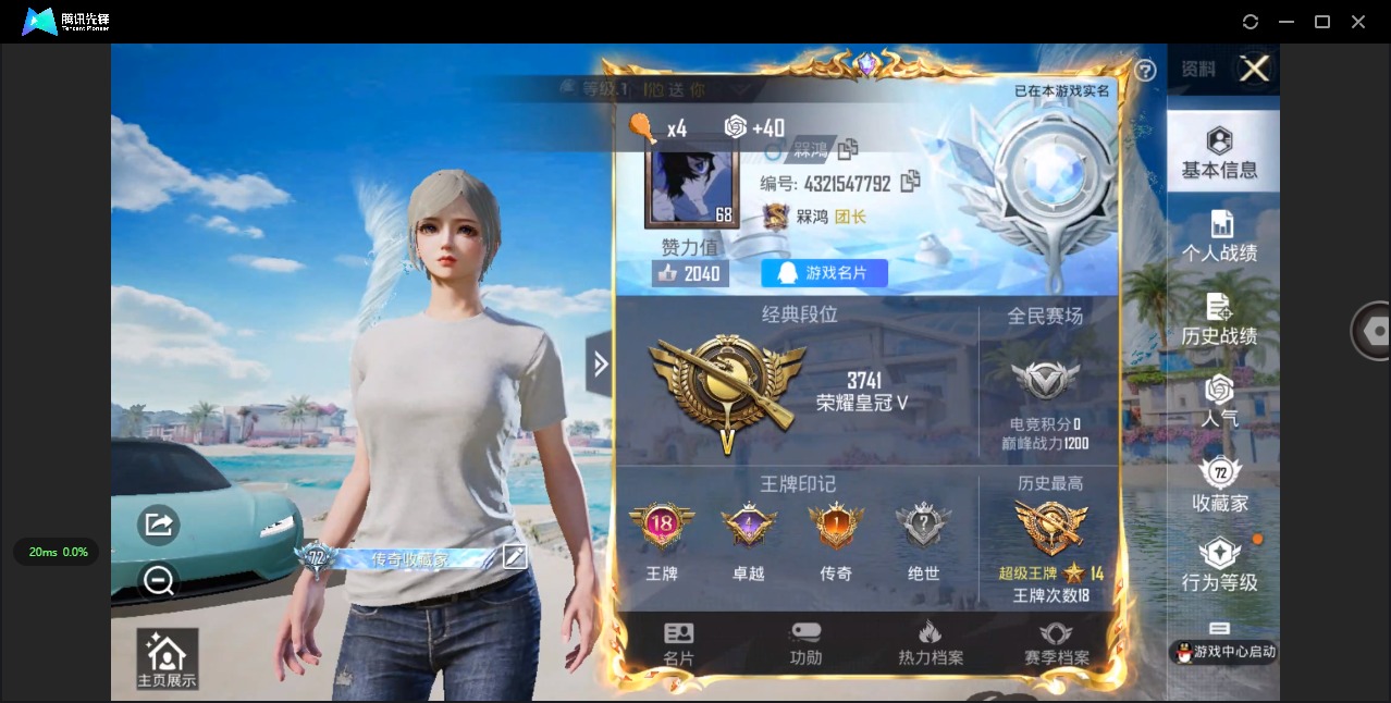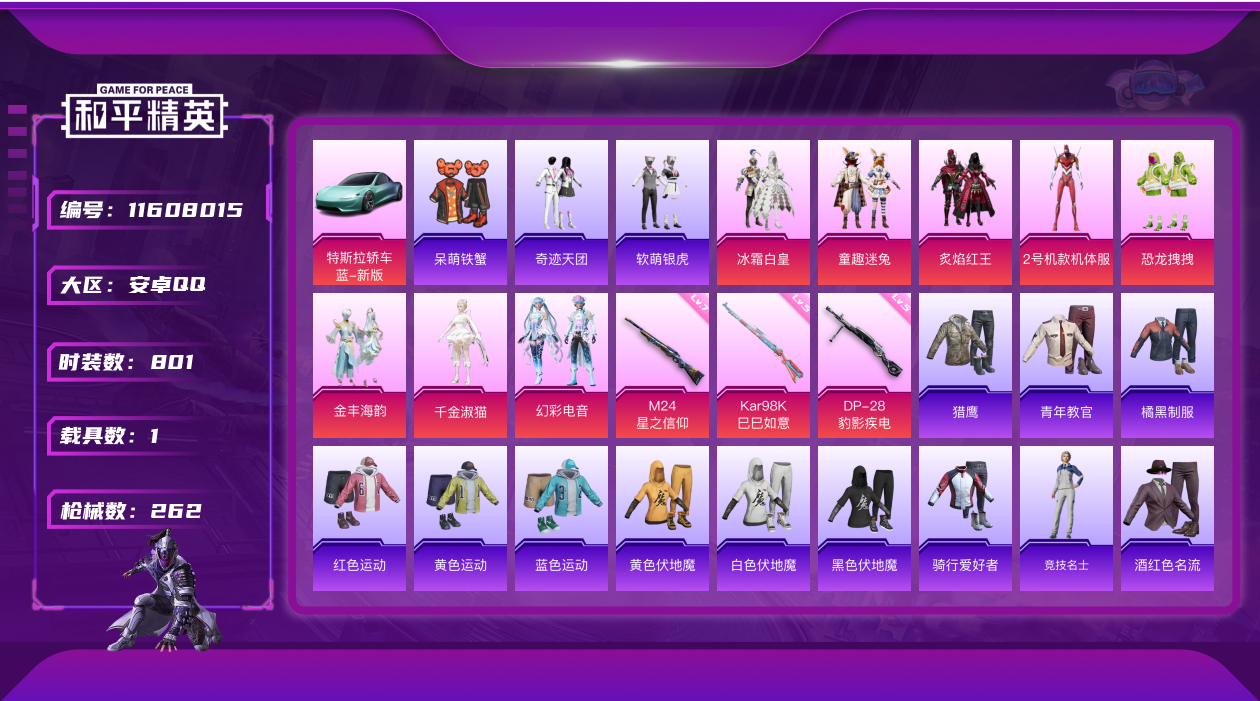[11608015]8粉装 3特效枪 1载具 18印记 可二次 可修改实名 身法装备:2号机款机体服(红螳螂) 优质装备:2号机款机体服(红螳螂),特斯拉Roadster(水滴蓝),M24星之信仰,炙焰红王,冰霜白皇,童趣迷兔,七级M24-星之信仰,千金淑猫,幻彩电音,Kar98K-巳巳如意 时装数:801 枪械数:262 战备数:1 热门装扮:恐龙拽拽,金丰海韵,软萌银虎,奇迹天团,呆萌铁蟹 五级特效枪:五级Kar98K-巳巳如意,五级DP-28-豹影疾电 紫色装扮:田园牧歌,轻风白浪,SS22特训,莱茵河畔,SS23特训,幻彩翩翩,妙红点点,香榭午后,娇憨猪猪,酸甜橘柚,萌趣咩咩,SS21特训,SS31特训套装,SS5特训,人气偶像,冰川特警,冷焰舞者,北国孤狼,旭日情侣,SS30特训套装,云朵鹅,雪绒豹,SS33特训套装,青涩时光,顶瓜瓜,SS20特训,青春冒险家,潮流游乐家,SS15特训,双棍侠客,时空追击者,暴风机械师,SS16特训,快乐星愿,银白舞王,SS13特训,骁骑迪迦,治愈之星,迅捷之星,科技之星,SS14特训,萌趣颜团子,特种颜团子,猎梦纪元,飞驰魅影,音速流光,极速竞梦,SS19特训,醇脆可可,吉莉礼服,甜心亚梦,虚音幻奏,明日香款战斗服,真嗣款战斗服,瑞龙福将,团圆交子,醒狮腾龙,SS17特训,冰川谧蓝,异彩先驱,SS18特训,都市魅力,酒红色名流,金鼠迎春,长空猛禽,雪山精英,霓虹极客,霓虹街区,青年教官,荣耀,蓝彩潮人,蓝色守护者,蓝色运动,虎虎生威吉莉,街头潮人,跃动心情,风行保卫者,飞行日记,龙腾端午,骑行爱好者,魅力单车,鹤鸣,麻辣教官,黄色伏地魔,黄色名流,黄色运动,黎明保卫者,黑色伏地魔,龙的传人,龟仙人,冰河战士,龙魂突击队,香桃花海,极速红龙,橘黑制服,沙漠雄狮,海岛探路者,涂山之恋,深蓝色名流,滨海假日,幻影武者,坚韧舞者,夏日音浪,完美偶像,帅气教官,幻世战舞者,战地督导,探宝勇士,湖蓝色名流,滨海厨神,绮丽涂鸦,生化防暴队,疯狂小兔子,白色伏地魔,破晓战魂,破蛋小黄鸡,神秘领域,甜蜜告白,福星高照,空岛之星,空投萌叽,竞技勇士朋克,竞技达人朋克,红色运动,甜蜜熊情侣,牛气冲天,灰色格斗者,灼焰舞者,炫蓝之夏,牛气满满,猛禽,猎鹰,镭射皇者,雏菊兔兔,萝兰蝴蝶,SS29特训,星途旅人,白光莹,纯真浪花,热情海星,曼妙人鱼,SS28特训