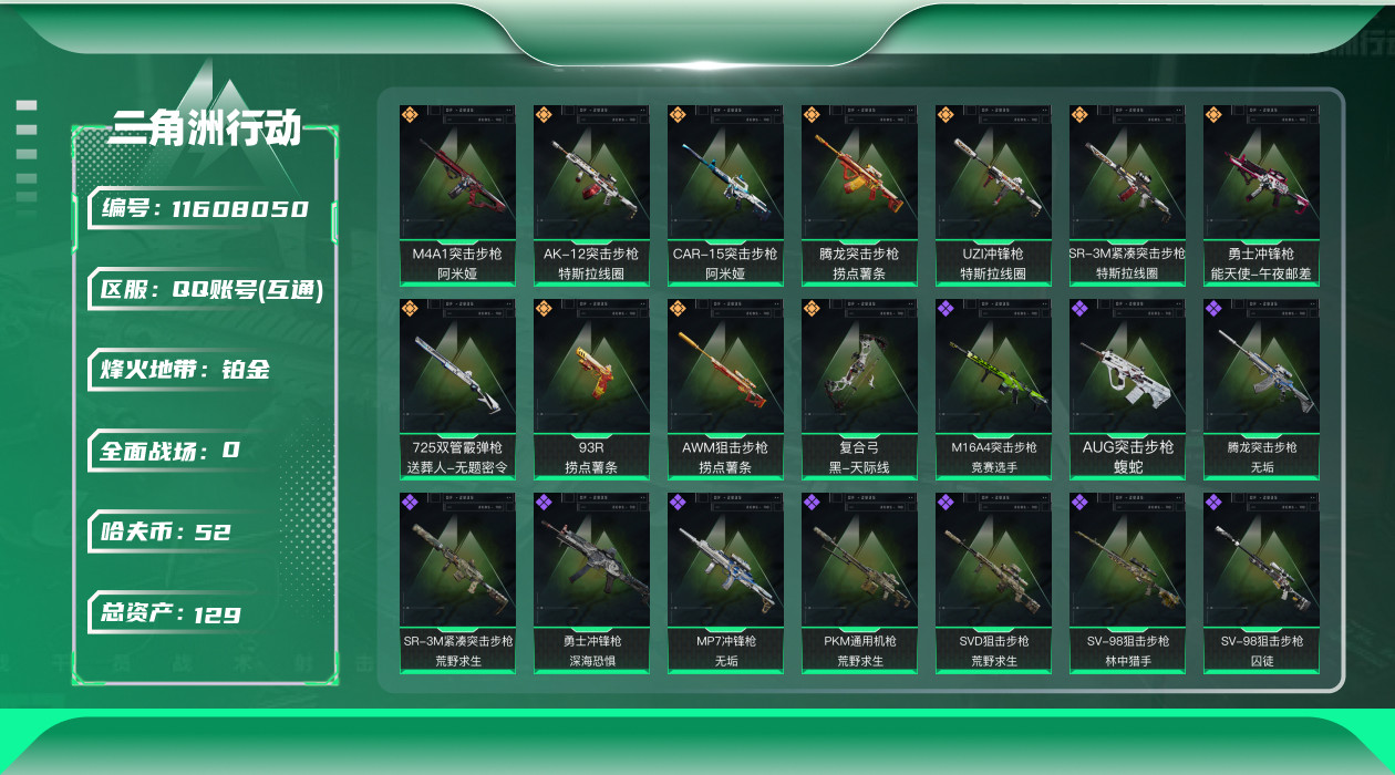 [11608050]总资产:129.9M 1干员外观 11传说枪械 哈夫币:52.189K 高级安全箱(9.17到期) 可二次 可修改实名 烽火地带段位:铂金 全面战场段位:无段位 传说武器皮肤:UZI冲锋枪-特斯拉线圈,AWM狙击步枪-捞点薯条,腾龙突击步枪-捞点薯条,93R-捞点薯条,AK-12突击步枪-特斯拉线圈,SR-3M紧凑突击步枪-特斯拉线圈,勇士冲锋枪-能天使-午夜邮差,复合弓-黑-天际线,725双管霰弹枪-送葬人-无题密令,M4A1突击步枪-阿米娅,CAR-15突击步枪-阿米娅 史诗武器皮肤:AUG突击步枪-蝮蛇,勇士冲锋枪-深海恐惧,M16A4突击步枪-竞赛选手,SV-98狙击步枪-林中猎手,SV-98狙击步枪-囚徒,腾龙突击步枪-无垢,MP7冲锋枪-无垢,SVD狙击步枪-荒野求生,SR-3M紧凑突击步枪-荒野求生,PKM通用机枪-荒野求生 干员外观:蜂医-送葬人·无题密令(S5)