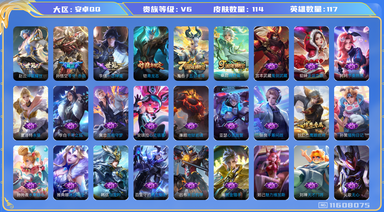 [11608075]V6 4传说 117英雄 114皮肤 可修改实名 优质装备:一念神魔,零号·赤焰,淬星耀世 珍宝阁皮:胡桃夹子 限定皮:鸣野蒿,五谷丰年,青龙志(铠年限) 史诗皮:百相守梦-黄忠,白龙吟,特工魅影,千年之狐,永昼,冰冠公主,末日机甲-吕布,猫狗日记-孙策,节奏热浪,水果甜心,天才门将,心灵骇客,鬼剑武藏,心灵战警,地狱岩魂,圣诞恋歌,鹰眼统帅,魅力维加斯,赏金猎手,千筹问战,无心