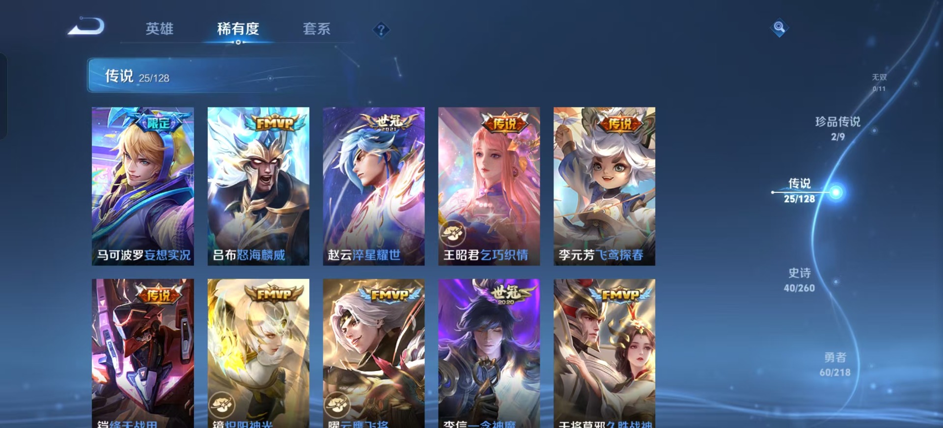 - PX_2086063-实名: 可修改 贵族等级: V6 英雄数: 125 皮肤数: 212 星传说: 幽冥之眼 传说皮: 地狱之眼,胖达荣荣,山海·炽霜斩,幻光神枪 限定皮: 李小龙,神威,如梦令-后羿,高山流水,五谷丰年,逐霄战戟,愿照·山河定,愿照·九州拓