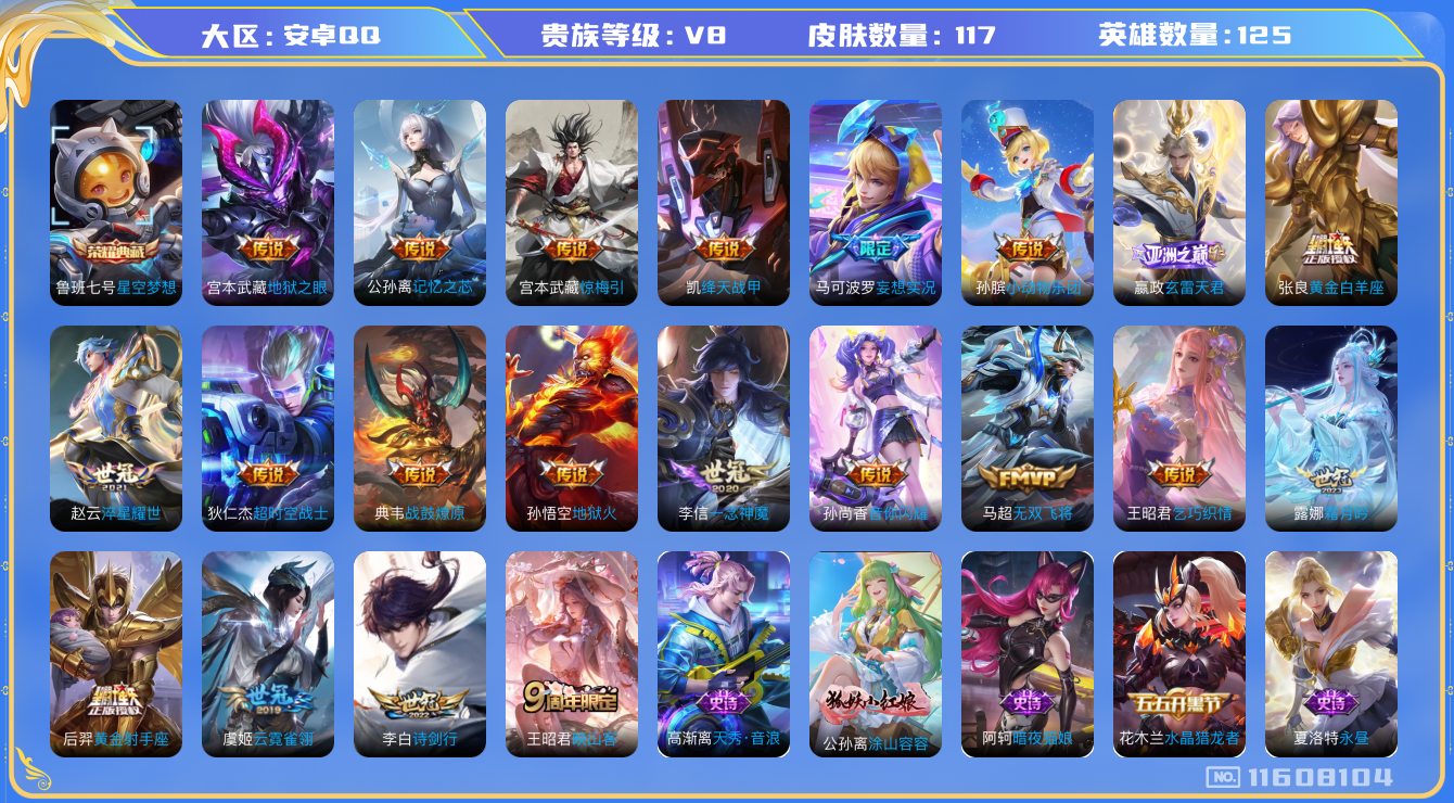 [11608104]V8 1典藏 22传说 125英雄 117皮肤 可修改实名 优质装备:星空梦想(太空人),黄金射手座,绛天战甲(鸡嘴战神),黄金白羊座,一念神魔,云霓雀翎,地狱火,地狱之眼,乞巧织情,淬星耀世,超时空战士-狄仁杰,无双飞将,音你闪耀(rap皮),记忆之芯(机甲兔),妄想实况,惊梅引,小动物乐团,霜月吟,玄雷天君,涂山容容 传说皮:典韦战鼓燎原 限定皮:映山客,诗剑行 史诗皮:鸭鸭历险记-刘禅,龙之律动,战舞者,百相守梦-百里守约,星界特工,白龙吟,特工魅影,永昼,闲日渔趣,冰冠公主,暗夜猫娘,龙骑士(小龙虾),乱世虎臣,女仆咖啡,摇滚巨星,水果甜心,天才门将,时之奇旅-安琪拉,乐园奇幻夜,舞动绿茵,纤云弄巧,逐浪之夏,月团寄思,水晶猎龙者,箭羽风息,圣诞狂欢,鹰眼统帅,魅力维加斯,天秀·音浪