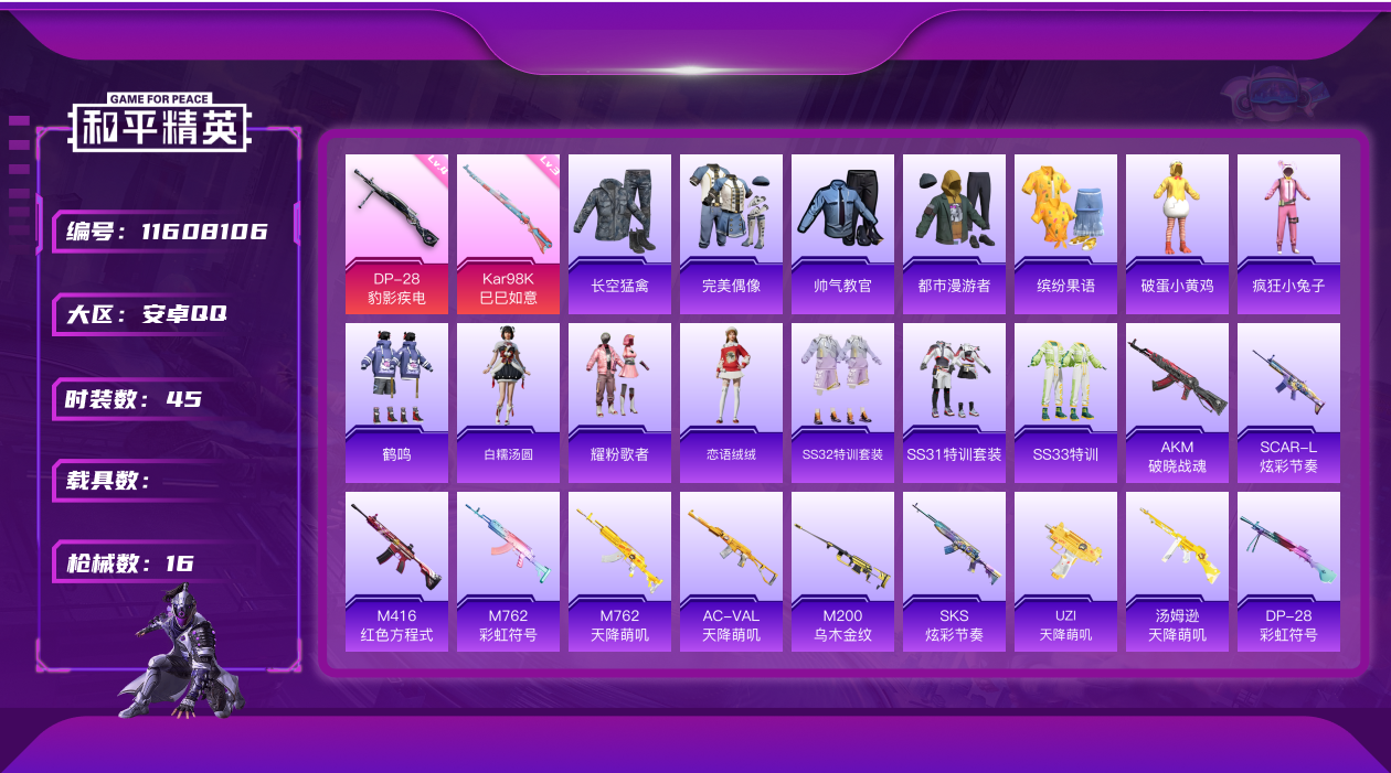 [11608106]2特效枪 可二次 可修改实名 优质装备:Kar98K-巳巳如意 稀有枪皮:DP-28-豹影疾电 四级特效枪:四级DP-28-豹影疾电 三级特效枪:三级Kar98K-巳巳如意 紫色装扮:SS31特训套装,SS33特训套装,都市漫游者,长空猛禽,缤纷果语,鹤鸣,完美偶像,帅气教官,疯狂小兔子,破蛋小黄鸡,耀粉歌者,SS32特训服(SS32特训套装),白糯汤圆,恋语绒绒 优质战备:第五大道降落伞