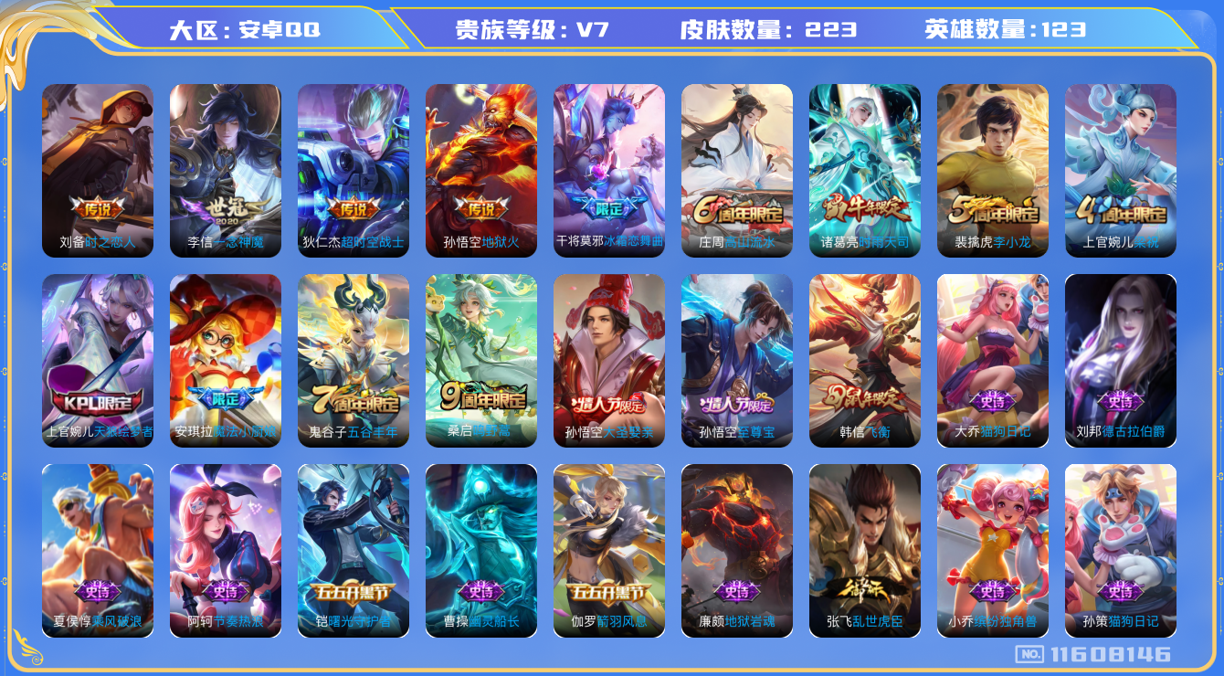 [11608146]V7 6传说 123英雄 223皮肤 可修改实名 优质装备:一念神魔,地狱火,时之恋人-刘备(电焊工),超时空战士-狄仁杰 珍宝阁皮:妄想食味,玩趣恶龙 限定皮:鸣野蒿,至尊宝,魔法小厨娘,时雨天司(水龙头),飞衡(韩信年限),高山流水,五谷丰年,梁祝,天狼绘梦者,李小龙,大圣娶亲,冰霜恋舞曲 史诗皮:紫霞仙子,电玩小子(小书包),黄金分割率,特工魅影,江河有灵,无限星赏官,偶像歌手,末日机甲-吕布,猫狗日记-孙策,猫狗日记-大乔,乱世虎臣,节奏热浪,修罗,女仆咖啡,水果甜心,绅士熊喵,天才门将,星夜王子,心灵骇客,功夫厨神,德古拉伯爵,暗隐猎兽者,幽灵船长,鬼剑武藏,暗渊魔法,心灵战警,地狱岩魂,纤云弄巧,缤纷独角兽,乘风破浪,逐浪之夏,水晶猎龙者,曙光守护者,箭羽风息,金属风暴,圣诞狂欢,圣诞恋歌,鹰眼统帅,魅力维加斯,未来纪元-赵云