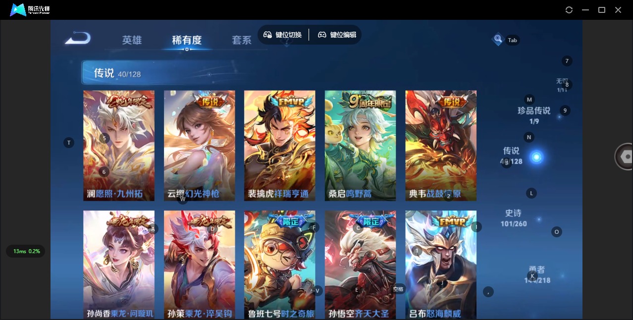 - [12235471]V7 1典藏 4传说 124英雄 194皮肤 可修改实名 优质装备:鸣剑·曳影,仲夏夜之梦(大飞蛾),涂山容容 珍宝阁皮:蔷薇恋人 限定皮:愿照·岁时盈(虞姬年限),鸣野蒿,至尊宝,飞衡(韩信年限),遇见飞天,梁祝,天狼绘梦者,李小龙,霸王别姬-项羽,霸王别姬-虞姬,大圣娶亲,天魔缭乱,蜜橘之夏 史诗皮:星界战将,龙之律动,紫霞仙子,黄金分割率,特工魅影,千年之狐,偶像歌手,龙骑士(小龙虾),乱世虎臣,节奏热浪,修罗,水果甜心,星夜王子,功夫厨神,暗隐猎兽者,鬼剑武藏,纤云弄巧,繁星吟游(呼啦呼啦),乘风破浪,逐浪之夏,水晶猎龙者,曙光守护者,原初追逐者,圣诞狂欢,鹰眼统帅,魅力维加斯,黎明之约,未来纪元-赵云