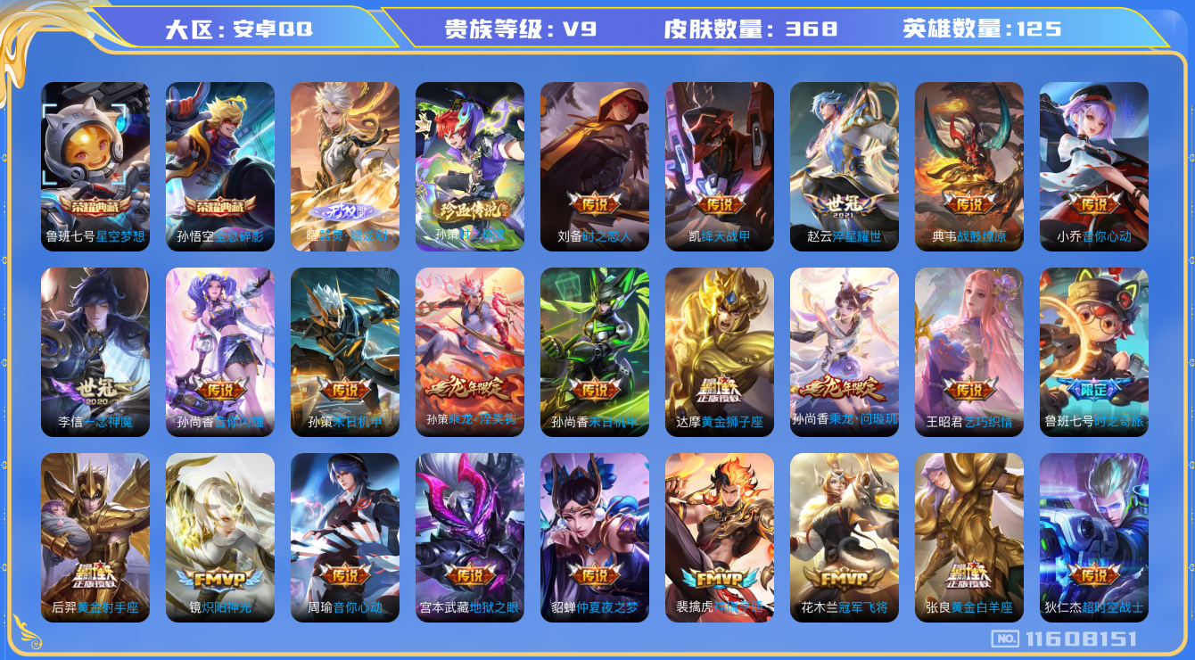 [11608151]V9 2典藏 1无双 1珍品传说 40传说 125英雄 368皮肤 可修改实名 优质装备:星空梦想(太空人),全息碎影(猴子典藏),器灵·螭龙剑,黄金狮子座,黄金射手座,冠军飞将,云鹰飞将(小将军),绛天战甲(鸡嘴战神),黄金白羊座,炽阳神光,一念神魔,云霓雀翎,末日机甲-孙尚香(绿蚂蚱),地狱火,仲夏夜之梦(大飞蛾),音你心动-小乔,零号·赤焰,地狱之眼,飞鸢探春,音你心动-周瑜,李逍遥,乞巧织情,时之恋人-刘备(电焊工),淬星耀世,超时空战士-狄仁杰,末日机甲-孙策,音你闪耀(rap皮),鲁班七号-时之奇旅 珍品传说:时之奇旅-孙策 传说皮:乘龙·问璇玑(孙尚香年限),乘龙·淬吴钩(孙策年限),典韦战鼓燎原,祥瑞亨通,幻光神枪 珍宝阁皮:妄想食味,蔷薇恋人 限定皮:愿照·九州拓(澜年限),鸣野蒿,异界灵契(白毛香),傲雪梅枪,寅虎·展翼(孙膑年限),神威(电光马子),高山流水,诗剑行,齐天大圣,怒海麟威,降魔,五谷丰年,青龙志(铠年限),冰锋战神,烈魂,岱宗(典韦年限),天狼溯光者,祈雪灵祝(雪兔子),李小龙,逐梦之影,如梦令-后羿,孙行者,乒乒小将,寅虎·御盾(廉颇年限),寅虎·瑞焰(虎皮蛋子),寅虎·赤拳(老虎年限),百木心枪 史诗皮:鸭鸭历险记-刘禅,苍鳞隐世,器灵·浮梦炉,化蝶舞,灵蛊蚀心,龙之律动,石田雨龙,茶境仙,百相守梦-百里守约,遇见神鹿,紫霞仙子,电玩小子(小书包),白龙吟,黄金分割率,特工魅影,千年之狐,永昼,江河有灵,匿光侦查者,末日机甲-莱西奥,魅语,百解令(蒙犽),无限星赏官,冰冠公主,偶像歌手,晚萤,暗夜猫娘,龙骑士(小龙虾),末日机甲-吕布,猫狗日记-孙策,猫狗日记-大乔,时之恋人-孙尚香,乱世虎臣,节奏热浪,修罗,女仆咖啡,摇滚巨星,水果甜心,绅士熊喵,天才门将,星夜王子,心灵骇客,功夫厨神,德古拉伯爵,暗隐猎兽者,幽灵船长,鬼剑武藏,暗渊魔法,心灵战警,乐园奇幻夜,天秀·启明,舞动绿茵,地狱岩魂,诗语江南,纤云弄巧,繁星吟游(呼啦呼啦),缤纷独角兽,乘风破浪,逐浪之夏,龙鼓争鸣,水晶猎龙者,曙光守护者,热力回旋,箭羽风息,金属风暴,圣诞狂欢,圣诞恋歌,鹰眼统帅,暗夜贵公子,魅力维加斯,赏金猎手,寅虎·御盾,千筹问战,无心,未来纪元-赵云