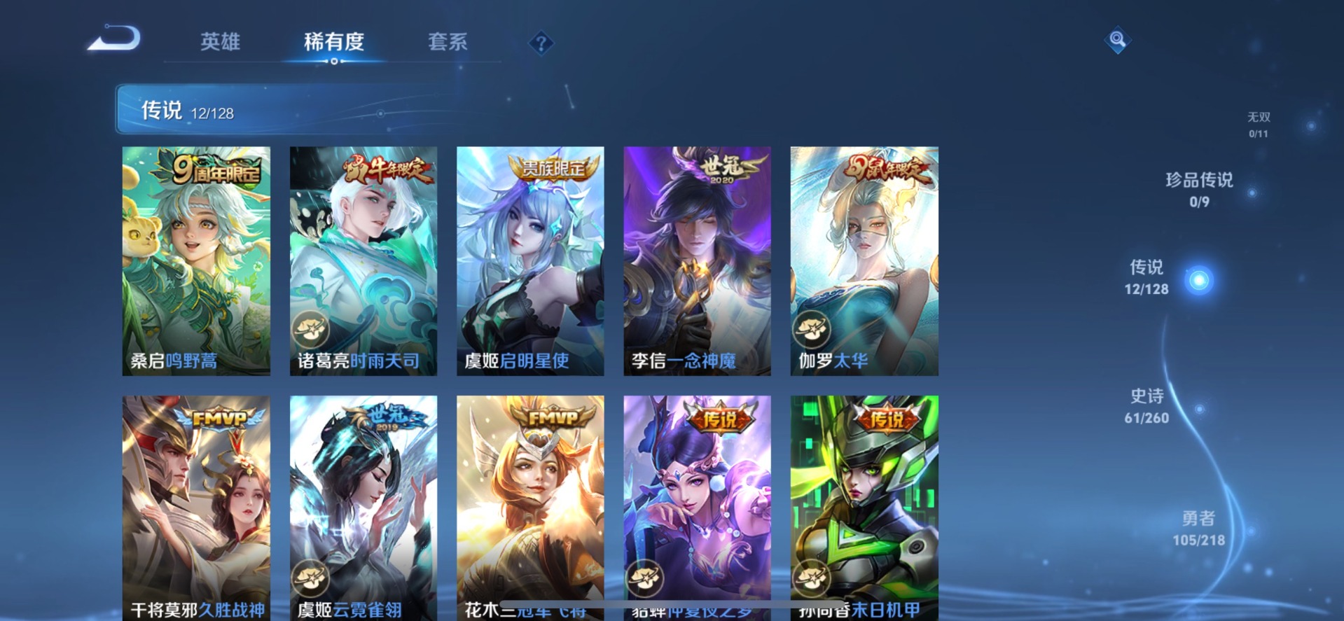 铠青龙志,伽罗太华,赵云百木心枪,典韦岱宗,后羿如梦令,诸葛亮时雨天司,裴擒虎李小龙,裴擒虎天狼狩猎者,上官婉儿梁祝,桑启鸣野蒿,孙悟空大圣娶亲,孙悟空至尊宝,赵云引擎之心,妲己时之彼端,韩信飞衡,韩信逐梦之影
