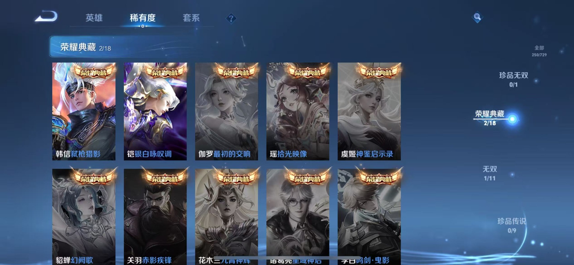 - PX_2099956-Q/至尊星耀/257皮肤/122英雄/0典藏/0珍品无双/0无双/0珍品传说/18传说/64史诗/7稀有英雄 【18 传说皮肤】胖达荣荣 梦奇,启明星使 虞姬,逐花归海 澜,无双飞将 马超,齐天大圣 孙悟空,猫影幻舞 貂蝉,地狱之眼 宫本武藏,炽阳神光 镜,黄金射手座 后羿,怒海麟威 吕布,黄金狮子座 达摩,久胜战神 干将莫邪,山海·炽霜斩 李信,一念神魔 李信,音你心动 小