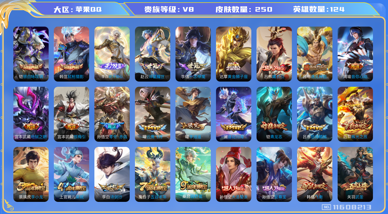 [11608213]V8 2典藏 1无双 17传说 124英雄 250皮肤 可修改实名 优质装备:银白咏叹调(倪克斯侍卫),弑枪猎影(韩信典藏),碎月剑心(李白无双),黄金狮子座,云鹰飞将(小将军),一念神魔,零号·赤焰,地狱之眼,音你心动-周瑜,李逍遥,淬星耀世,惊梅引,遇见神鼓,澜逐花归海 传说皮:吕布曦玄引 珍宝阁皮:妄想食味,玩趣恶龙 限定皮:鸣野蒿,至尊宝,飞衡(韩信年限),诗剑行,怒海麟威,五谷丰年,青龙志(铠年限),武圣,梁祝,李小龙,辉光之辰,大圣娶亲 史诗皮:星界战将,蔬乡物语(鲁班七号),百相守梦-黄忠,紫霞仙子,苍穹之光,电玩小子(小书包),黄金分割率,特工魅影,千年之狐,江河有灵,魅语,高渐离燃音魔法,蒙恬荣光圣徽,无限星赏官,冰冠公主,偶像歌手,晚萤,电玩·爆裂旋风,末日机甲-吕布,猫狗日记-孙策,乱世虎臣,节奏热浪,修罗,女仆咖啡,摇滚巨星,水果甜心,天才门将,星夜王子,德古拉伯爵,暗隐猎兽者,幽灵船长,鬼剑武藏,心灵战警,舞动绿茵,地狱岩魂,纤云弄巧,乘风破浪,曙光守护者,箭羽风息,金属风暴,原初追逐者,圣诞狂欢,圣诞恋歌,鹰眼统帅,暗夜贵公子,魅力维加斯,黎明之约,无心,未来纪元-赵云