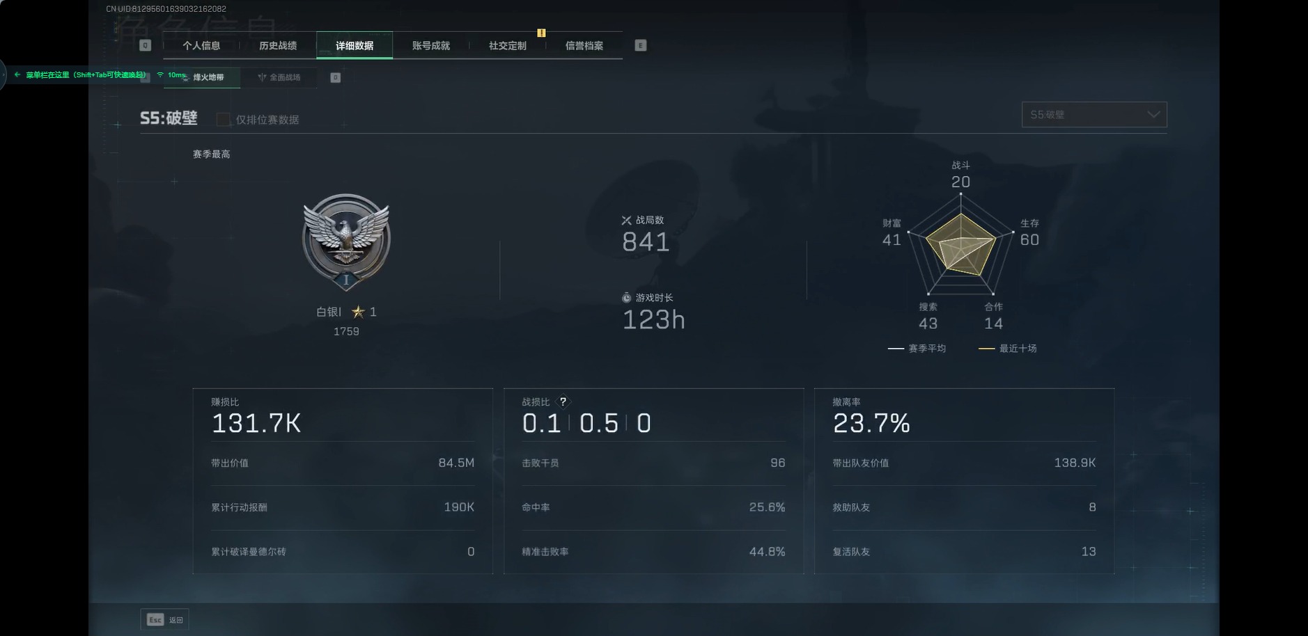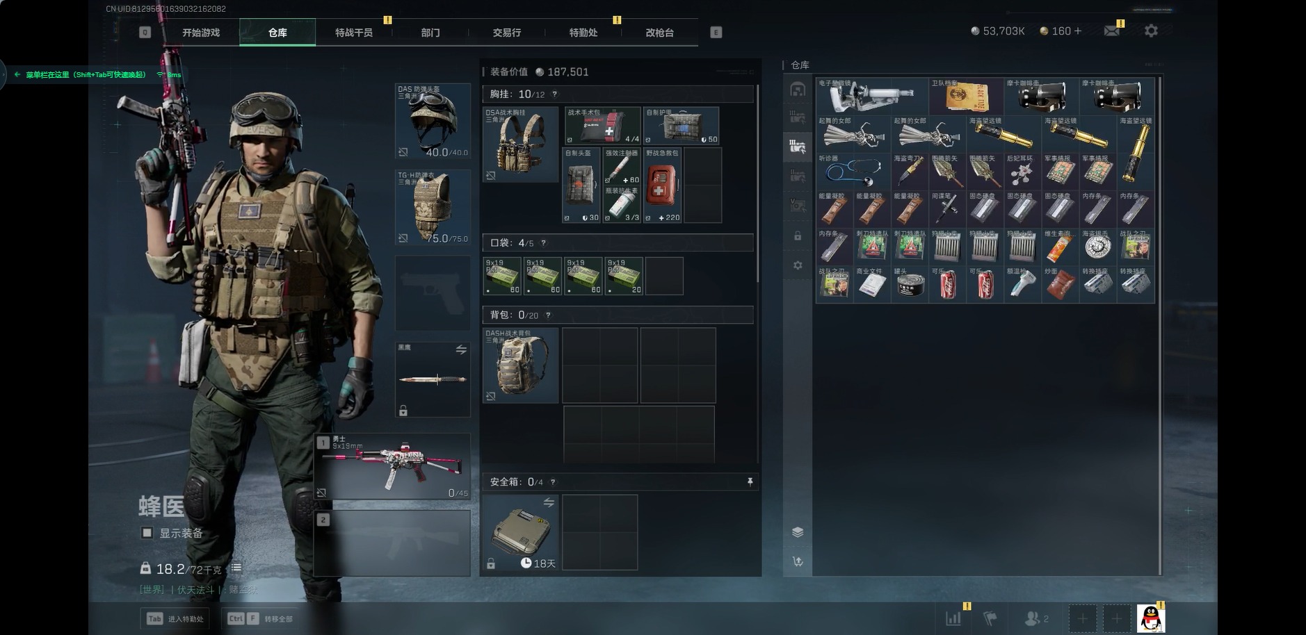 - [11603476]总资产:134.3M 7传说枪械 哈夫币:120K 进阶安全箱(9.17到期) 可二次 可修改实名 烽火地带段位:青铜 全面战场段位:上等兵 传说武器皮肤:M4A1突击步枪-阿米娅,CAR-15突击步枪-阿米娅,复合弓-黑-天际线,AK-12突击步枪-特斯拉线圈,SR-3M紧凑突击步枪-特斯拉线圈,UZI冲锋枪-特斯拉线圈,勇士冲锋枪-能天使-午夜邮差 史诗武器皮肤:AUG突击步枪-蝮蛇,MP5冲锋枪-深海恐惧,勇士冲锋枪-深海恐惧,SV-98狙击步枪-林中猎手,M250通用机枪-囚徒,SCAR-H战斗步枪-囚徒,Vector冲锋枪-阿萨拉文明