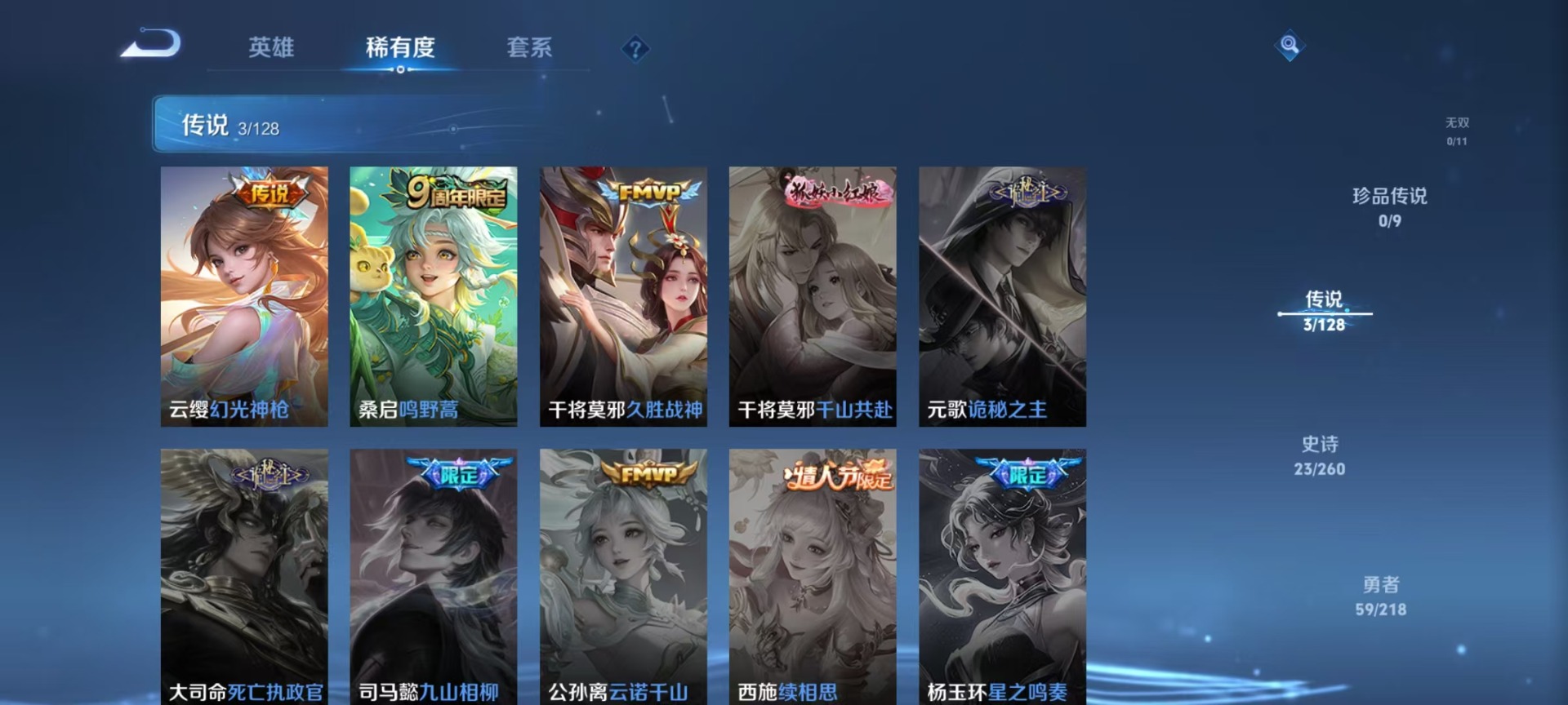- [12204315]V6 1珍品传说 9传说 119英雄 136皮肤 可修改实名 优质装备:怪盗基德,无双飞将,浮生妄,鹤羽星尊,霜月吟 传说皮:幻光神枪 珍宝阁皮:万物之道,蔷薇恋人 限定皮:愿照·九州拓(澜年限),愿照·岁时盈(虞姬年限),愿照·山河定(司空震年限),傲雪梅枪,绯月行,高山流水,李小龙,逐梦之影,玉兔公主 史诗皮:器灵·浮梦炉,化蝶舞,龙之律动,藏狐·褐绒,茶境仙,芈月浮光幕影,黄金分割率,特工魅影,永昼,江河有灵,百解令(蒙犽),冰冠公主,猫狗日记-孙策,时之恋人-孙尚香,乱世虎臣,节奏热浪,修罗,女仆咖啡,水果甜心,天才门将,星夜王子,心灵骇客,暗隐猎兽者,乘风破浪,逐浪之夏,水晶猎龙者,曙光守护者,金属风暴,圣诞狂欢,圣诞恋歌,鹰眼统帅,魅力维加斯,黎明之约