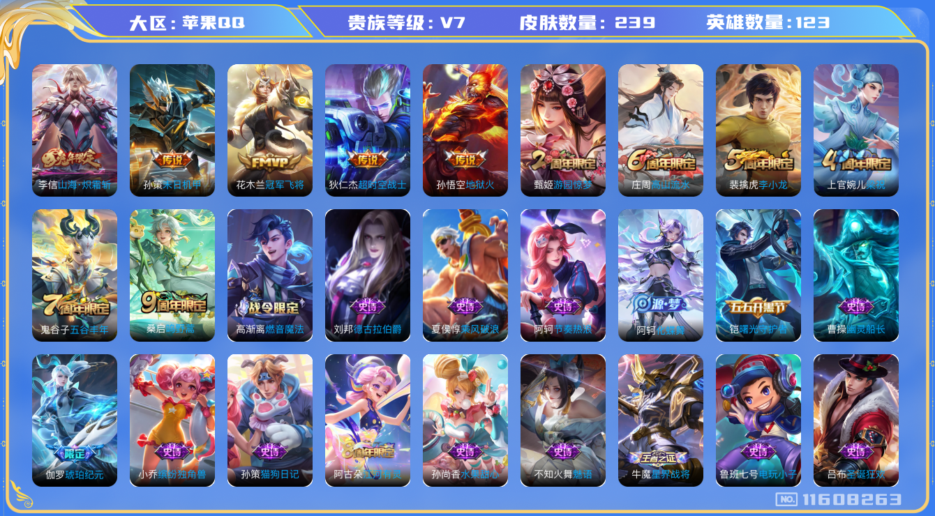 [11608263]V7 6传说 123英雄 239皮肤 可修改实名 优质装备:冠军飞将,地狱火,超时空战士-狄仁杰,末日机甲-孙策,山海·炽霜斩(李信年限) 珍宝阁皮:蔷薇恋人,玩趣恶龙 限定皮:鸣野蒿,高山流水,五谷丰年,游园惊梦,梁祝,李小龙 史诗皮:鸭鸭历险记-刘禅,化蝶舞,星界战将,龙之律动,破空之剑,蒙犽顽岩魄,琥珀纪元伽罗,紫霞仙子,电玩小子(小书包),黄金分割率,特工魅影,千年之狐,江河有灵,魅语,百解令(蒙犽),高渐离燃音魔法,蒙恬荣光圣徽,无限星赏官,偶像歌手,末日机甲-吕布,猫狗日记-孙策,节奏热浪,女仆咖啡,水果甜心,天才门将,星夜王子,心灵骇客,功夫厨神,德古拉伯爵,暗隐猎兽者,幽灵船长,鬼剑武藏,心灵战警,舞动绿茵,纤云弄巧,繁星吟游(呼啦呼啦),拒霜思,缤纷独角兽,乘风破浪,逐浪之夏,水晶猎龙者,曙光守护者,金属风暴,原初追逐者,圣诞狂欢,圣诞恋歌,鹰眼统帅,暗夜贵公子,魅力维加斯,黎明之约,无心,未来纪元-赵云