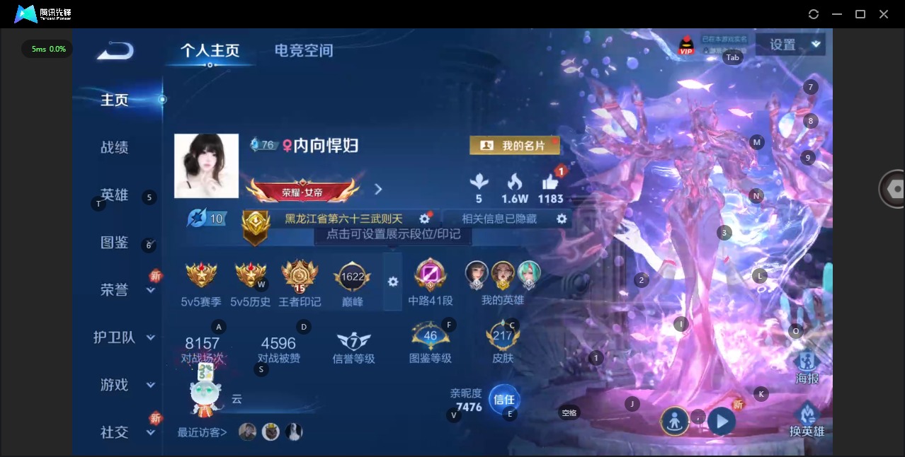 - PX_2074560-安卓Q 【包人脸】 英雄数量:123 皮肤数量:248 贵族等级:贵族V8 【信用分79,游戏无限制】【星传说 星际治安官 未来机甲】无双限定1 传说品质19 史诗品质59甄姬雪境奇遇 祈雪灵祝 愿照·千秋盛 愿照·岁时盈 诗剑行 猫影幻舞 云霓雀翎 一念神魔 幻光神枪 绯月行 末日机甲女 浮生妄 无限倾心女 启明星使 黄金射手座 胖达荣荣 超时空战士男 鸣野蒿 逐花归海 乘