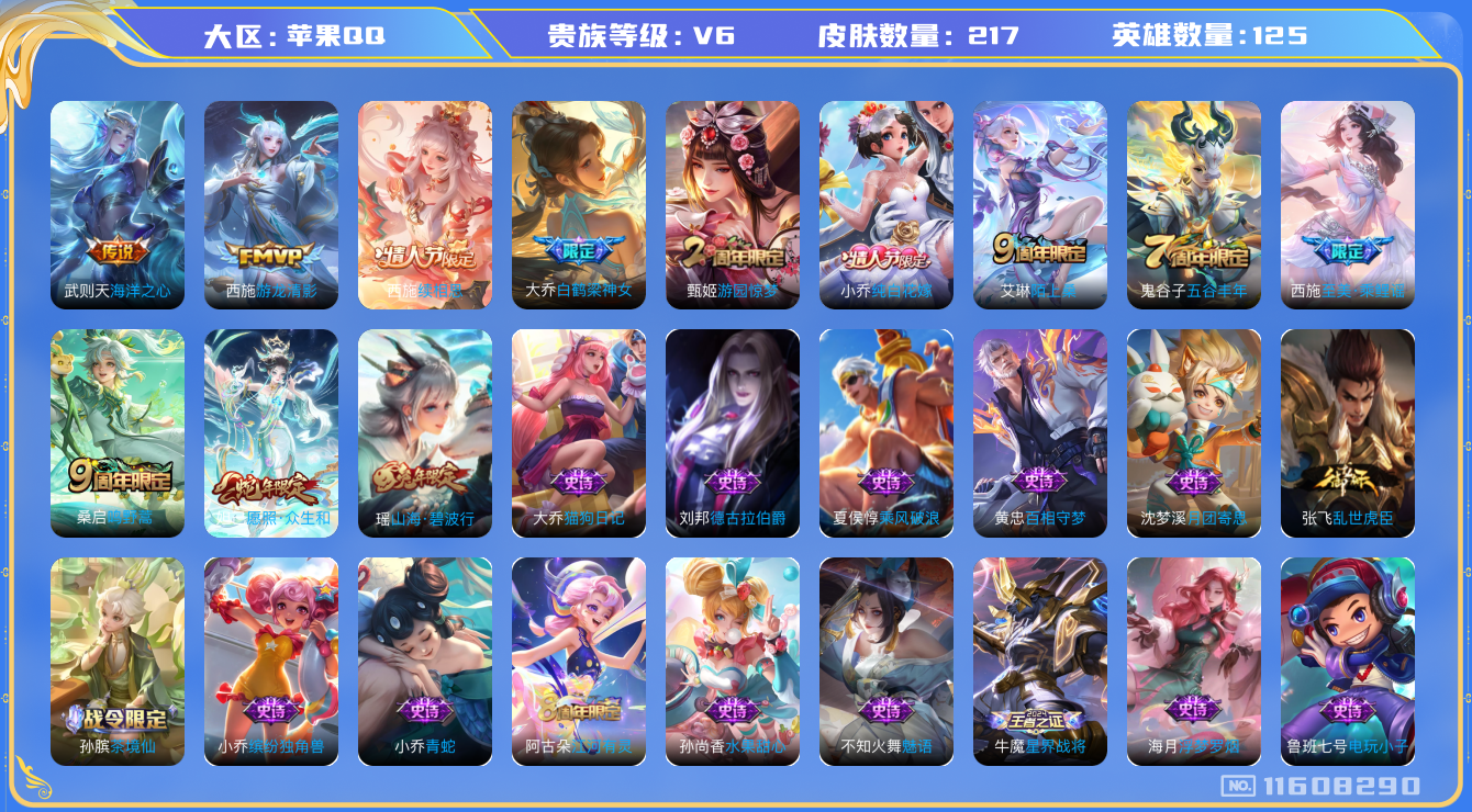 [11608290]V6 5传说 125英雄 217皮肤 典藏英雄武则天 可修改实名 优质装备:海洋之心,游龙清影(小青龙),涂山容容 传说皮:续相思 珍宝阁皮:蔷薇恋人,女武神 限定皮:愿照·众生和(妲己年限),陌上桑,鸣野蒿,白鹤梁神女,山海·碧波行(瑶年限),至美·乘鲤谣,五谷丰年,游园惊梦,纯白花嫁 史诗皮:星界战将,龙之律动,茶境仙,百相守梦-黄忠,织梦人,遇见神鹿,紫霞仙子,电玩小子(小书包),千年之狐,江河有灵,浮梦罗烟,魅语,蒙恬荣光圣徽,冰冠公主,青蛇,龙骑士(小龙虾),末日机甲-吕布,猫狗日记-大乔,乱世虎臣,女仆咖啡,摇滚巨星,水果甜心,心灵骇客,时之奇旅-安琪拉,德古拉伯爵,暗隐猎兽者,鬼剑武藏,心灵战警,舞动绿茵,诗语江南,繁星吟游(呼啦呼啦),缤纷独角兽,乘风破浪,逐浪之夏,月团寄思,水晶猎龙者,金属风暴,原初追逐者,圣诞恋歌,鹰眼统帅,魅力维加斯,黎明之约,无心,未来纪元-赵云