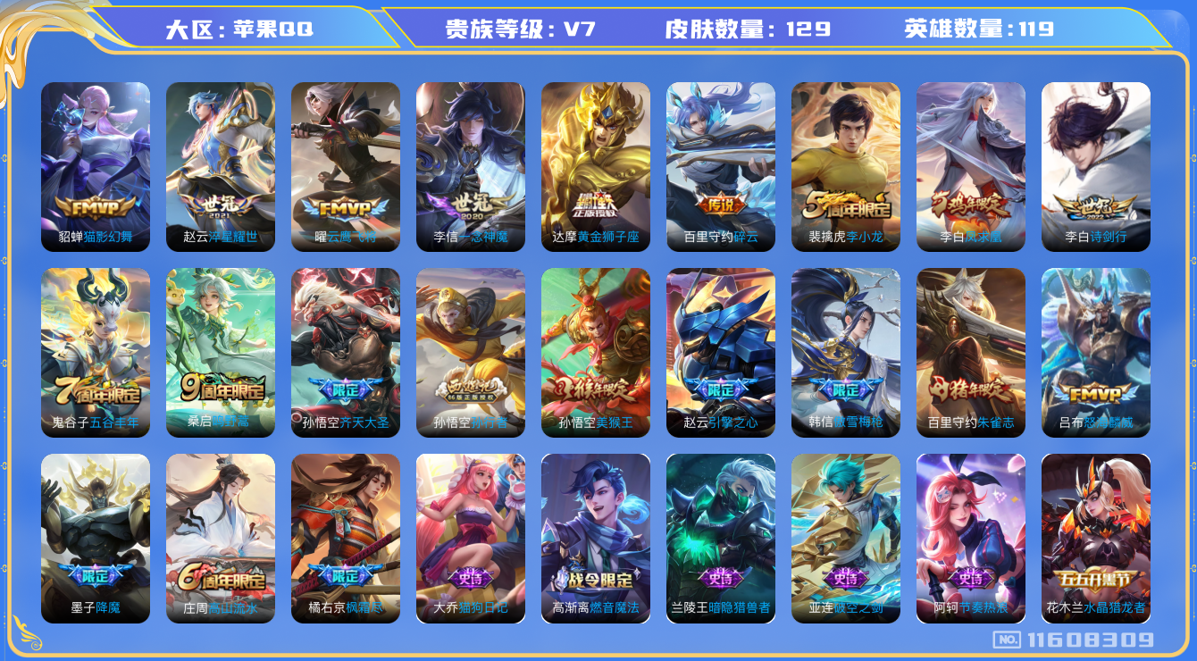 [11608309]V7 12传说 119英雄 129皮肤 可修改实名 优质装备:黄金狮子座,云鹰飞将(小将军),猫影幻舞,一念神魔,淬星耀世,碎云 珍宝阁皮:蔷薇恋人 限定皮:鸣野蒿,凤求凰(白切鸡),傲雪梅枪,高山流水,诗剑行,齐天大圣,怒海麟威,降魔,五谷丰年,李小龙,朱雀志(守约年限),孙行者,引擎之心,美猴王,枫霜尽 史诗皮:破空之剑,琥珀纪元伽罗,超元猎域,高渐离燃音魔法,电玩·爆裂旋风,猫狗日记-孙策,猫狗日记-大乔,节奏热浪,女仆咖啡,水果甜心,天才门将,暗隐猎兽者,心灵战警,地狱岩魂,水晶猎龙者,金属风暴,鹰眼统帅,魅力维加斯,赏金猎手,无心