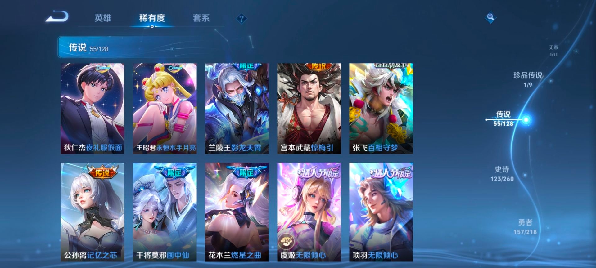 刘备时之恋人,铠绛天战甲,铠琥珀纪元,张飞百相守梦,赵云淬星耀世,干将莫邪久胜战神,小乔音你心动,干将莫邪画中仙,李信一念神魔,孙尚香音你闪耀,孙策末日机甲,达摩黄金狮子座,王昭君乞巧织情,露娜霜月吟,镜炽阳神光,公孙离记忆之芯,宫本武藏惊梅引,裴擒虎祥瑞亨通,艾琳觅芳踪,狄仁杰神器·狴犴令,狄仁杰夜礼服假面,曜云鹰飞将,马超琥珀纪元,马超无双飞将,李元芳飞鸢探春,百里守约碎云,澜逐花归海,虞姬云霓雀翎,王昭君永恒水手月亮,云缨幻光神枪