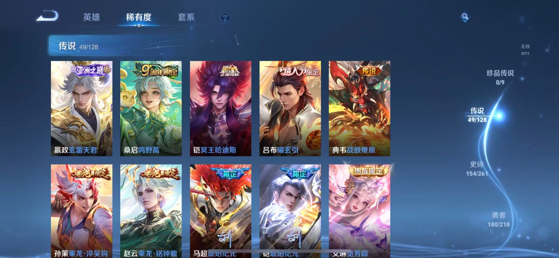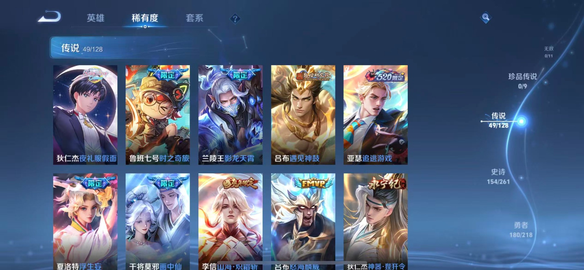 黄忠烈魂,老夫子圣诞老人,铠青龙志,伽罗天狼溯光者,伽罗太华,苏烈玄武志,赵云百木心枪,孙膑天狼运算者,干将莫邪冰霜恋舞曲,典韦岱宗,孙尚香异界灵契,项羽霸王别姬,后羿无尽星芒,吕布御风骁将,露娜启示之音,后羿辉光之辰,镜匿光追影者,庄周云端筑梦师,诸葛亮时雨天司,兰陵王默契交锋,公孙离玉兔公主,兰陵王影龙天霄,裴擒虎李小龙,裴擒虎天狼狩猎者,上官婉儿梁祝,上官婉儿天狼绘梦者,花木兰默契交锋,花木兰青春决赛季,安琪拉魔法小厨娘,马可波罗逐梦之星,马可波罗山海·玄木吟,桑启鸣野蒿,猪八戒猪悟能,孙悟空孙行者,孙悟空大圣娶亲,孙悟空至尊宝,百里玄策白虎志,马超神威,雅典娜神奇女侠,赵云引擎之心,韩信傲雪梅枪,韩信飞衡,韩信逐梦之影,百里守约朱雀志,虞姬霸王别姬,关羽武圣,关羽冰锋战神