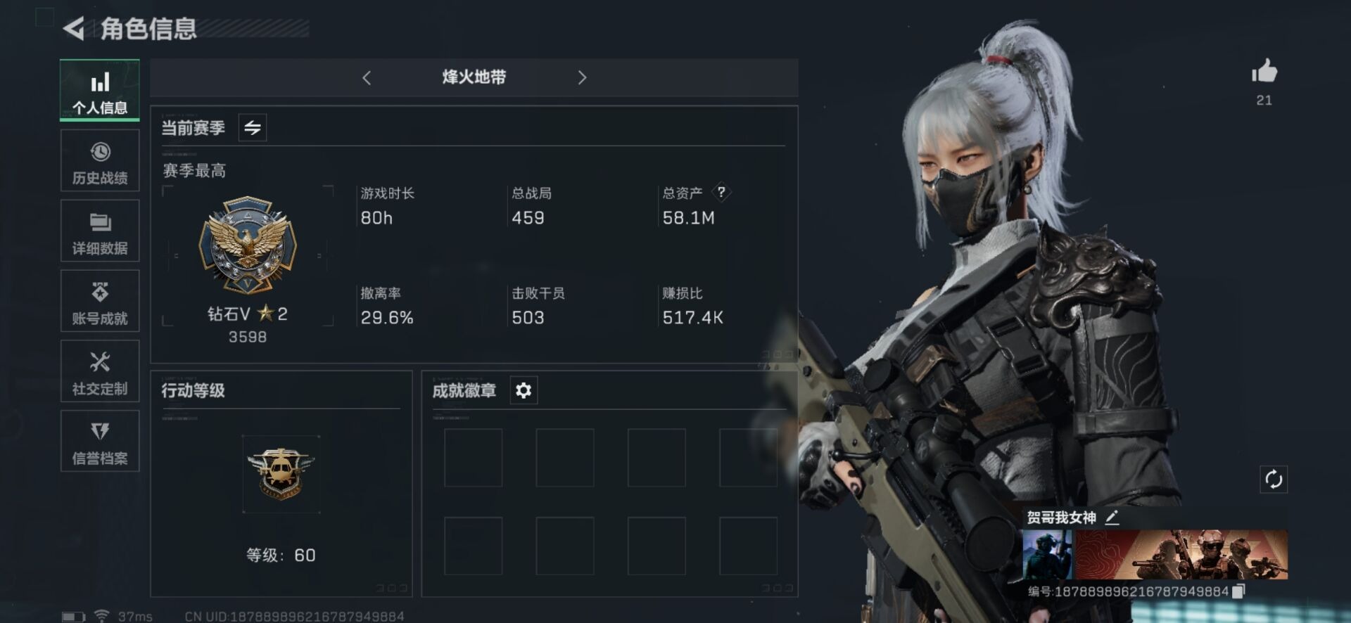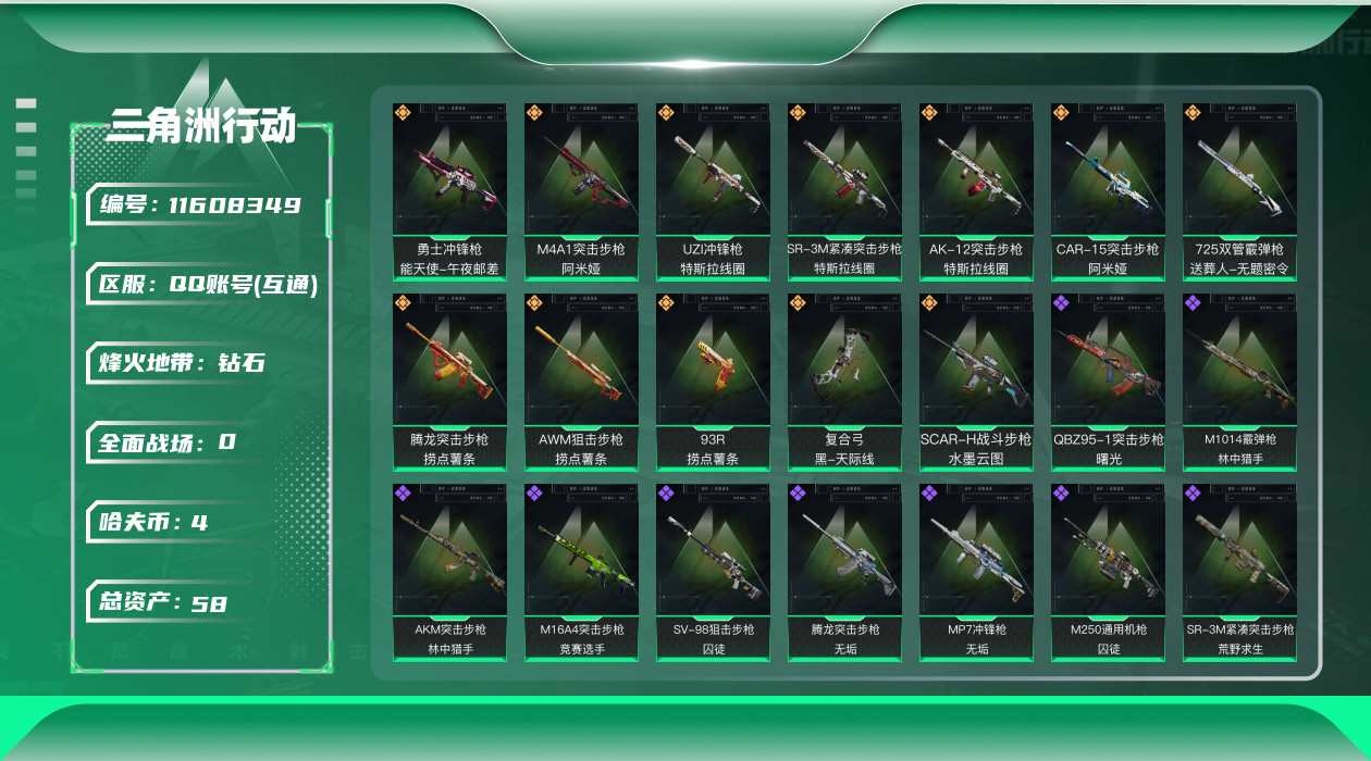 [11608349]总资产:58.1M 1干员外观 12传说枪械 哈夫币:4.415K 高级安全箱(2×3)9.15号到期 可二次 可修改实名 烽火地带段位:钻石 全面战场段位:无段位 传说武器皮肤:SCAR-H战斗步枪-水墨云图,93R-捞点薯条,AWM狙击步枪-捞点薯条,腾龙突击步枪-捞点薯条,AK-12突击步枪-特斯拉线圈,CAR-15突击步枪-阿米娅,SR-3M紧凑突击步枪-特斯拉线圈,UZI冲锋枪-特斯拉线圈,勇士冲锋枪-能天使-午夜邮差,复合弓-黑-天际线,M4A1突击步枪-阿米娅,725双管霰弹枪-送葬人-无题密令 史诗武器皮肤:PKM通用机枪-蝮蛇,M16A4突击步枪-竞赛选手,PKM通用机枪-荒野求生,AKM突击步枪-林中猎手,SR-3M紧凑突击步枪-荒野求生,M1014霰弹枪-林中猎手,SV-98狙击步枪-林中猎手,SVD狙击步枪-荒野求生,AS Val突击步枪-典狱官,M250通用机枪-囚徒,SV-98狙击步枪-囚徒,腾龙突击步枪-无垢,MP7冲锋枪-无垢,PSG-1射手步枪-无垢,QBZ95-1突击步枪-曙光 干员外观:骇爪-水墨云图
