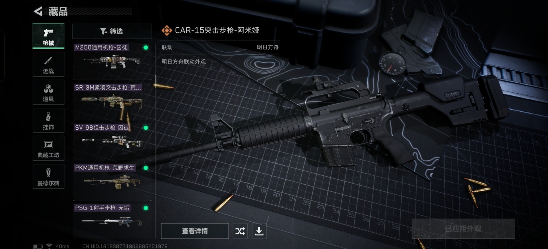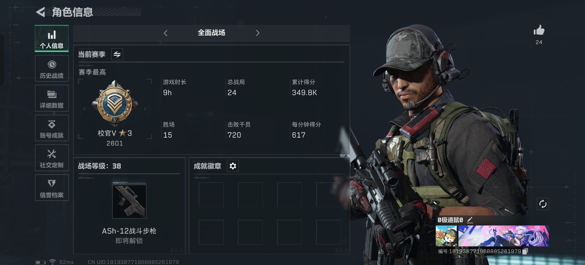 - [11626695]总资产:119.5 2传说枪械 进阶安全箱(9.17到期) 可二次 可修改实名 烽火地带段位:钻石 全面战场段位:无段位 哈夫币:65.775 传说武器皮肤:复合弓-黑-天际线,CAR-15突击步枪-阿米娅 史诗武器皮肤:M16A4突击步枪-竞赛选手,SV-98狙击步枪-林中猎手,M250通用机枪-囚徒