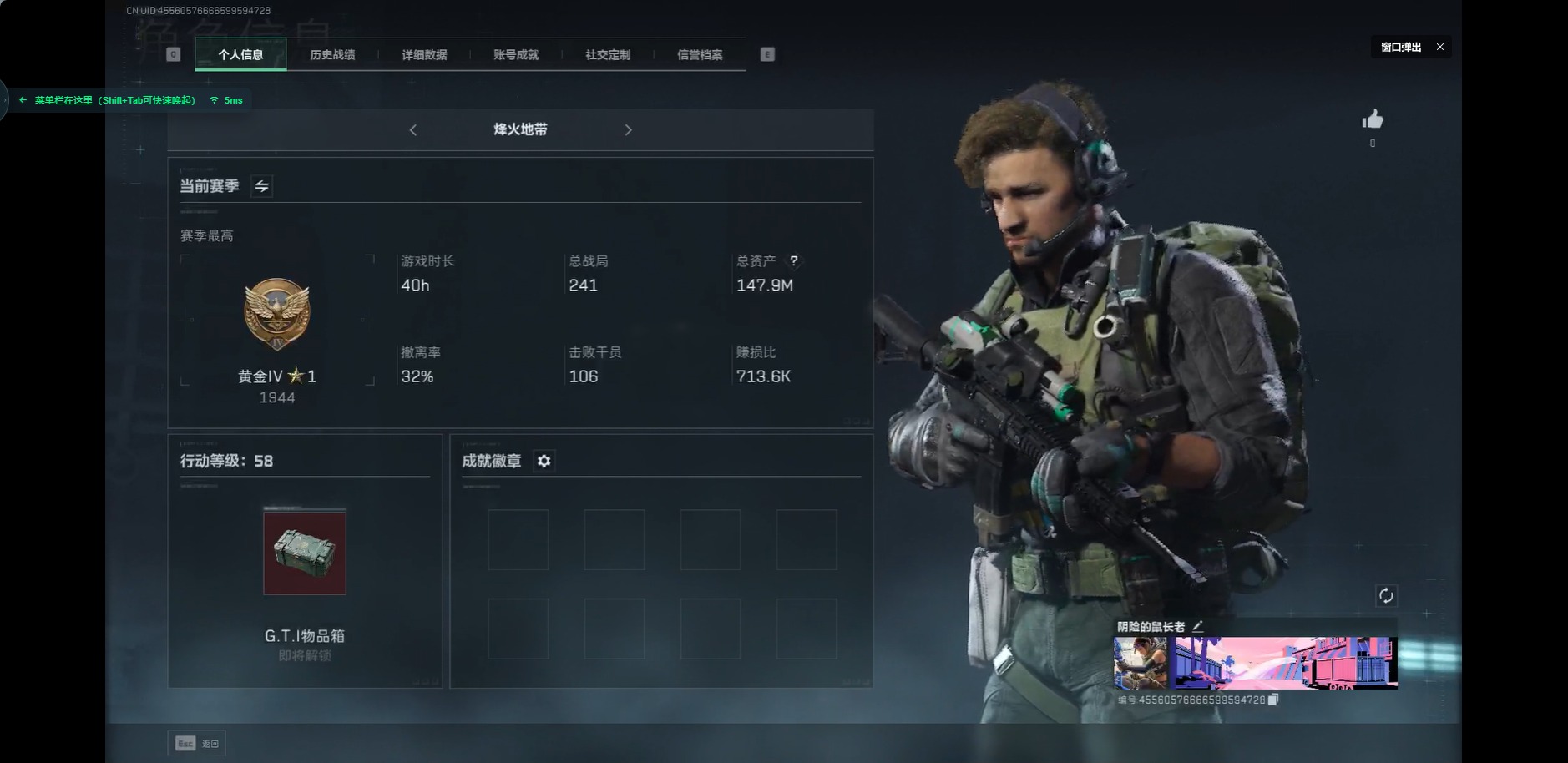 - [12027761]总资产:357.1M 7干员外观 3近战传说 40传说枪械 哈夫币:25.340K 可二次 可修改实名 优质装备:近战-影锋,近战-黑海,近战-北极星,K416突击步枪-命运(典藏),腾龙突击步枪-气象感应(典藏),SCAR-H战斗步枪-电玩高手 烽火地带段位:钻石 全面战场段位:上等兵 传说武器皮肤:SCAR-H战斗步枪-水墨云图,SR-25射手步枪-水墨云图,AWM狙击步枪-影锋,M1014霰弹枪-影锋,M250通用机枪-游乐场,G3战斗步枪-流光铂影,AKM突击步枪-流光铂影,G18-飞虎,AK-12突击步枪-特斯拉线圈,SR-3M紧凑突击步枪-特斯拉线圈,UZI冲锋枪-特斯拉线圈,勇士冲锋枪-能天使-午夜邮差,腾龙突击步枪-捞点薯条,93R-捞点薯条,AWM狙击步枪-捞点薯条,K437突击步枪-北极星,SMG45冲锋枪-骑士,QCQ171冲锋枪-北极星,725双管霰弹枪-送葬人-无题密令,M4A1突击步枪-阿米娅,CAR-15突击步枪-阿米娅,复合弓-黑-天际线,K437突击步枪-极速狂飙,M4A1突击步枪-蚀金玫瑰,Ash-12战斗步枪-极速狂飙,M4A1突击步枪-阿瑞斯之怒,AK-12突击步枪-夜鹰,MP5冲锋枪-黑海,QJB201轻机枪-黑海,Vector冲锋枪-阿瑞斯之怒,沙漠之鹰-阿瑞斯之怒,AKM突击步枪-零度协议,M700狙击步枪-零度协议,M7战斗步枪-零度协议 史诗武器皮肤:MP7冲锋枪-原型机(典藏),M249轻机枪-甜心子弹,AUG突击步枪-甜心子弹,M14射手步枪-甜心子弹,QBZ95-1突击步枪-ACE,Vector冲锋枪-红色彗星,PTR-32战斗步枪-ACE,SKS射手步枪-ACE,M700狙击步枪-蝮蛇,G3战斗步枪-战场英杰,SR-3M紧凑突击步枪-荒野求生,PKM通用机枪-荒野求生,M1014霰弹枪-林中猎手,SVD狙击步枪-荒野求生,MP7冲锋枪-无垢,腾龙突击步枪-无垢,AS Val突击步枪-典狱官,AS Val突击步枪-尖端治疗,QJB201轻机枪-Old Habits,SVD狙击步枪-暗夜猎手,PKM通用机枪-守夜人,M700狙击步枪-守夜人,沙漠之鹰-曙光,QBZ95-1突击步枪-曙光,Ash-12战斗步枪-守夜人,SR-25射手步枪-尖端治疗,SG552突击步枪-深海恐惧,AKM突击步枪-林中猎手,M14射手步