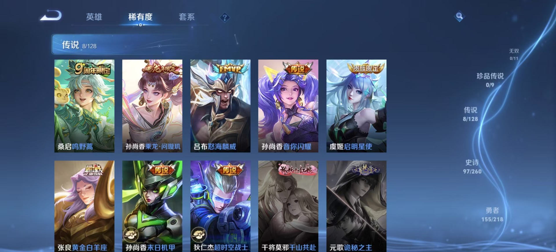 - [12110731]V8 1典藏 6传说 122英雄 233皮肤 可修改实名 优质装备:九霄神辉(木兰典藏),云鹰飞将(小将军),猫影幻舞,一念神魔,末日机甲-孙尚香(绿蚂蚱) 珍宝阁皮:胡桃夹子,蔷薇恋人 限定皮:至尊宝,神威(电光马子),飞衡(韩信年限),诗剑行,五谷丰年,梁祝,李小龙,辉光之辰,霸王别姬-项羽,青春决赛季,唐三藏,山海·玄木吟(马可年限) 史诗皮:紫霞仙子,电玩小子(小书包),黄金分割率,特工魅影,千年之狐,永昼,魅语,冰冠公主,偶像歌手,末日机甲-吕布,猫狗日记-孙策,乱世虎臣,节奏热浪,修罗,女仆咖啡,水果甜心,天才门将,星夜王子,功夫厨神,德古拉伯爵,暗隐猎兽者,幽灵船长,鬼剑武藏,舞动绿茵,地狱岩魂,纤云弄巧,缤纷独角兽,乘风破浪,逐浪之夏,月团寄思,水晶猎龙者,曙光守护者,箭羽风息,金属风暴,圣诞狂欢,圣诞恋歌,鹰眼统帅,暗夜贵公子,魅力维加斯,无心,未来纪元-赵云