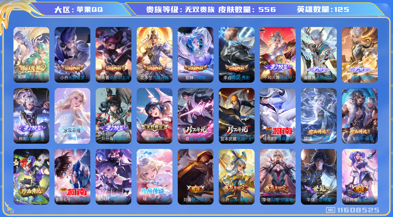 [11608525]无双贵族 5典藏 1珍品无双 7无双 9珍品传说 71传说 125英雄 556皮肤 可修改实名 优质装备:馥梦繁花,天鹅之梦(小乔典藏),杀手不太冷,鸣剑·曳影,九霄神辉(木兰典藏),幻阙歌(貂蝉典藏),真我赫兹(瑶)(瑶无双),韩信群星魔术团(韩信无双),花合斗,离恨烟(公孙离无双),雪境奇遇-甄姬,器灵·螭龙剑,天机白泽,江户川柯南,怪盗基德,器灵·落星盏,酷洛米之心,大耳狗之梦,朽木白哉,黑崎一护,黄金狮子座,黄金射手座,冠军飞将,云鹰飞将(小将军),绛天战甲(鸡嘴战神),黄金白羊座,久胜战神,炽阳神光,一念神魔,云霓雀翎,末日机甲-孙尚香(绿蚂蚱),仲夏夜之梦(大飞蛾),零号·赤焰,地狱之眼,音你心动-周瑜,胖达荣荣,乞巧织情,时之恋人-刘备(电焊工),游龙清影(小青龙),淬星耀世,超时空战士-狄仁杰,末日机甲-孙策,无双飞将,音你闪耀(rap皮),碎云,天秀幻梦,山海·炽霜斩(李信年限),山海·琳琅生(小乔年限),炽翼辉光(娃娃菜牛角包),燃星之曲,画中仙,浮生妄,鹤羽星尊,灼幽烈阳,妄想实况,妄想奇谈,惊梅引,鲁班七号-时之奇旅,霜月吟,澜逐花归海,艾琳觅芳踪,牧神诗旅,玄雷天君,千劫归真,诡秘之主,千山共赴,涂山容容 珍品传说:时之奇旅-孙策,兔狲·蓬尾 传说皮:典韦战鼓燎原,落雪白狼,死亡执政官,九山相柳,云诺千山,续相思,星之鸣奏,祥瑞亨通,幻光神枪 珍宝阁皮:妄想食味,优雅恋人,蔷薇恋人,女武神 限定皮:愿照·九州拓(澜年限),愿照·福禄聚(蔡文姬年限),愿照·岁时盈(虞姬年限),愿照·山河定(司空震年限),愿照·众生和(妲己年限),愿照·千秋盛(女娲年限),逐霄战戟,映山客,陌上桑,鸣野蒿,夏侯惇霜北刀,至尊宝,傲雪梅枪,寅虎·展翼(孙膑年限),白鹤梁神女,神威(电光马子),山海·碧波行(瑶年限),至美·乘鲤谣,至美·化雀舞,遇见飞天,高山流水,诗剑行,怒海麟威,降魔,五谷丰年,冰锋战神,武圣,游园惊梦,梁祝,御风骁将(吕布年限),逐梦之星,烈魂,天狼溯光者,天狼绘梦者,李小龙,朱雀志(守约年限),永曜之星,辉光之辰,霸王别姬-虞姬,默契交锋-花木兰,猪悟能,一生所爱,大圣娶亲,青春决赛季,蜜橘之夏,匿光追影者,寅虎·赤拳(老虎年限),百木心枪,启示之音,时之奇旅-妲己,神器·万象笔,山海·玄木吟(马可年限) 史诗皮:赞萌露比,鸭鸭历险记-