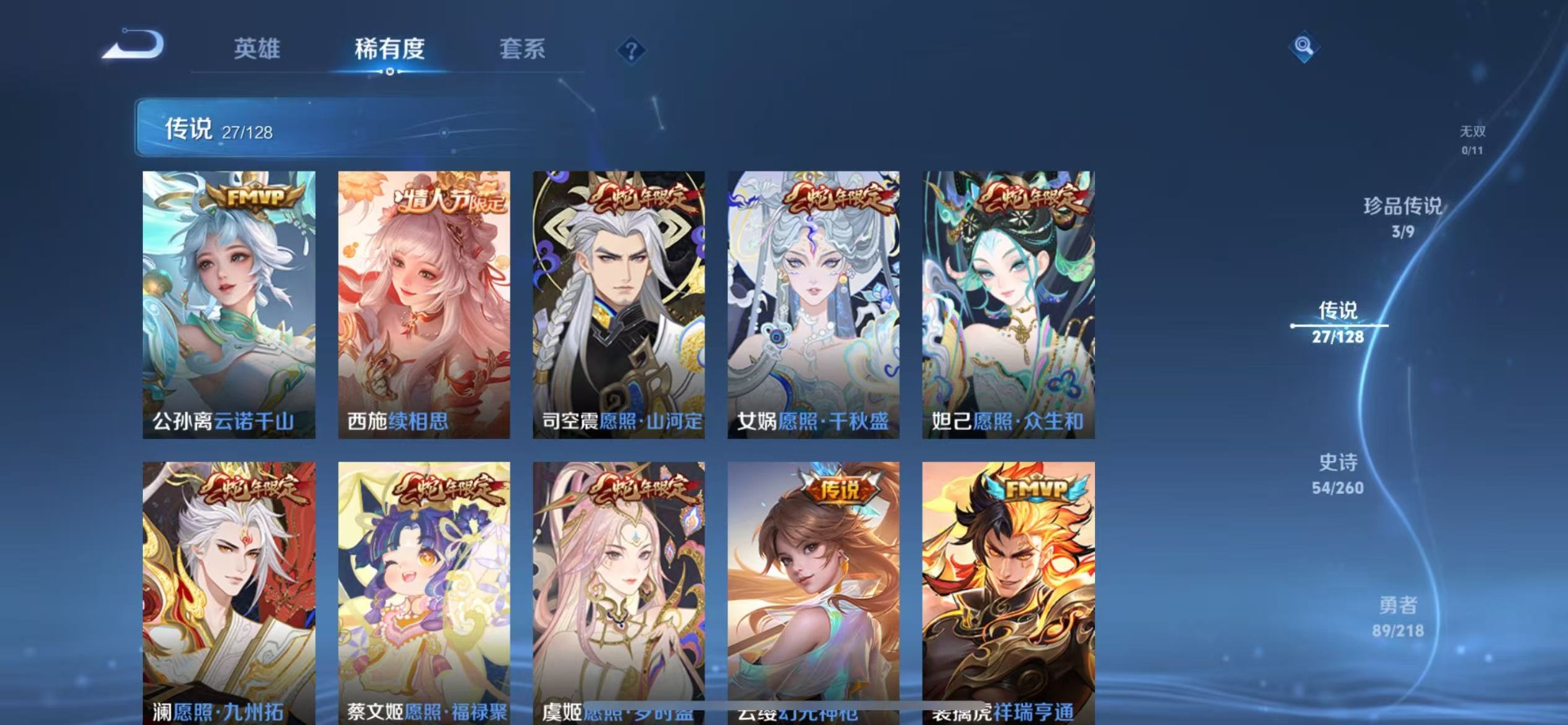 - PX_2094631-51 安卓QQ/最强王者/267皮肤/125英雄/2典藏/0珍品无双/0无双/3珍品传说/23传说/79史诗/9稀有英雄 【3 珍品传说】黑崎一护 宫本武藏,怪盗基德 马可波罗,时之奇旅 孙策, 【2 典藏皮肤】全息碎影 孙悟空,弑枪猎影 韩信, 【23 传说皮肤】启明星使 虞姬,逐花归海 澜,电玩·雷克斯 澜,无双飞将 马超,李逍遥 曜,云鹰飞将 曜,齐天大圣 孙悟空,诗