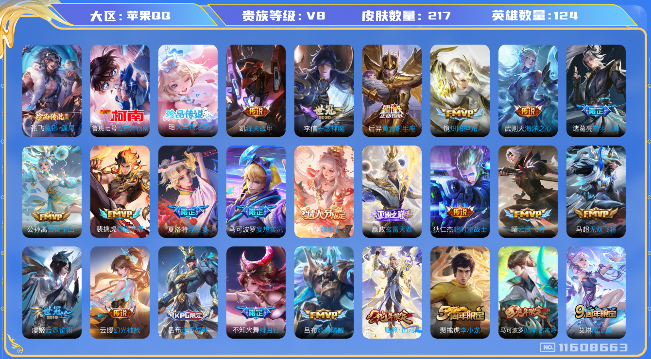 [11608663]V8 3珍品传说 27传说 124英雄 217皮肤 可修改实名 优质装备:江户川柯南,大耳狗之梦,黄金射手座,云鹰飞将(小将军),绛天战甲(鸡嘴战神),炽阳神光,一念神魔,云霓雀翎,海洋之心,超时空战士-狄仁杰,无双飞将,浮生妄,鹤羽星尊,妄想实况,玄雷天君 珍品传说:兔狲·蓬尾 传说皮:云诺千山,续相思,祥瑞亨通,幻光神枪 珍宝阁皮:女武神 限定皮:愿照·九州拓(澜年限),愿照·福禄聚(蔡文姬年限),愿照·岁时盈(虞姬年限),愿照·山河定(司空震年限),愿照·众生和(妲己年限),愿照·千秋盛(女娲年限),逐霄战戟,陌上桑,鸣野蒿,绯月行,怒海麟威,李小龙,山海·玄木吟(马可年限) 史诗皮:鸭鸭历险记-刘禅,苍鳞隐世,器灵·浮梦炉,糖绘人间,狼魂孤将,绮世丹青,瑰影绮梦,化蝶舞,谪仙醉月,龙之律动,雪豹·霜爪,藏狐·褐绒,布丁狗之誓,茶境仙,怒海争锋,蒙犽顽岩魄,琥珀纪元伽罗,遇见神鹿,紫霞仙子,特工魅影,江河有灵,青蛇,偶像歌手,白蛇,晚萤,末日机甲-吕布,时之恋人-孙尚香,乱世虎臣,修罗,摇滚巨星,水果甜心,功夫厨神,暗隐猎兽者,幽灵船长,鬼剑武藏,乐园奇幻夜,缤纷独角兽,乘风破浪,逐浪之夏,水晶猎龙者,热力回旋,箭羽风息,金属风暴,圣诞狂欢,鹰眼统帅,魅力维加斯,赏金猎手