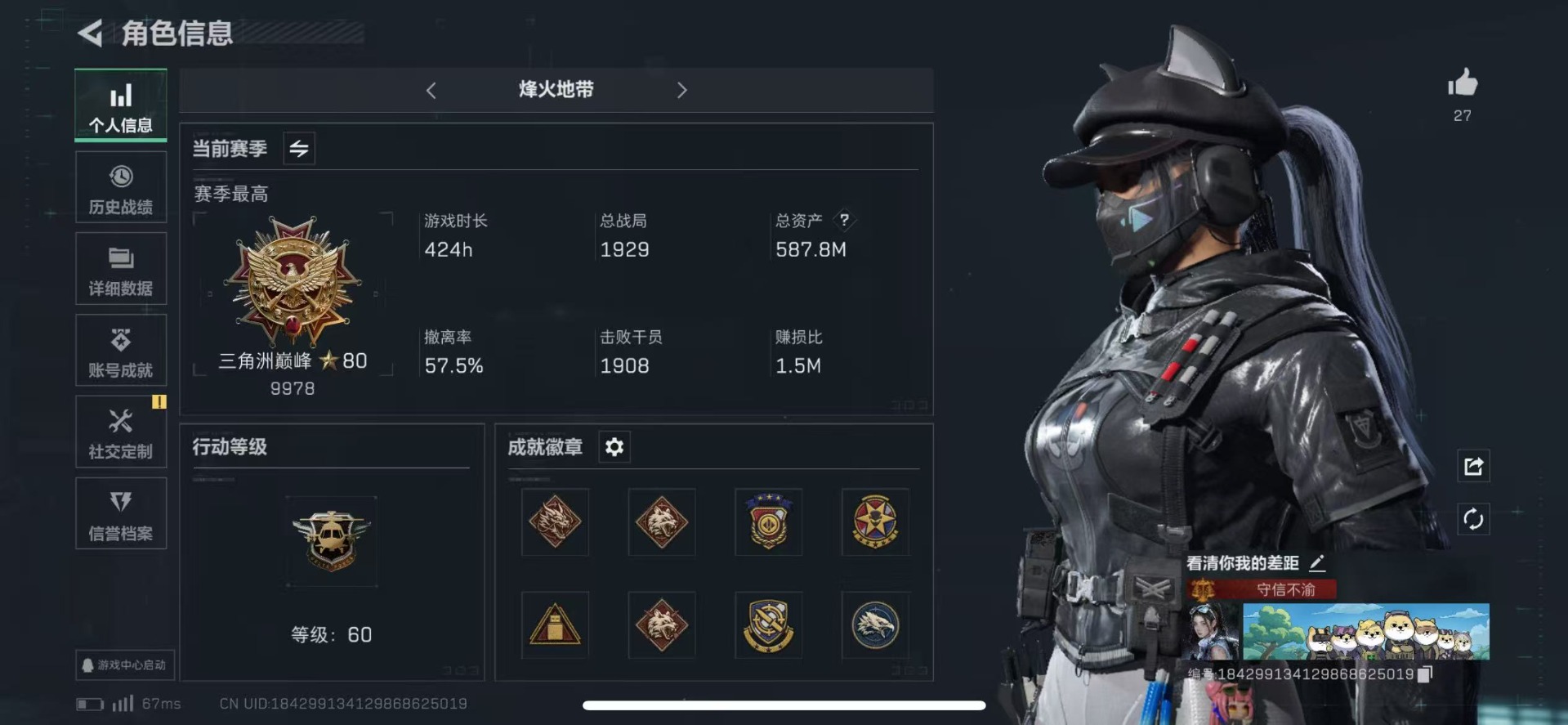 [11608680]总资产:587.8M 1近战传说 6传说枪械 哈夫币:423K 高级安全箱(9.17到期) 可二次 可修改实名 优质装备:近战-北极星 烽火地带段位:三角洲巅峰 全面战场段位:军士长 传说武器皮肤:AK-12突击步枪-夜鹰,腾龙突击步枪-捞点薯条,AK-12突击步枪-特斯拉线圈,CAR-15突击步枪-阿米娅,M4A1突击步枪-阿米娅 史诗武器皮肤:AUG突击步枪-蝮蛇,Ash-12战斗步枪-守夜人,M16A4突击步枪-竞赛选手,AS Val突击步枪-尖端治疗,SG552突击步枪-尖端治疗,MP5冲锋枪-深海恐惧,AKM突击步枪-林中猎手,腾龙突击步枪-无垢