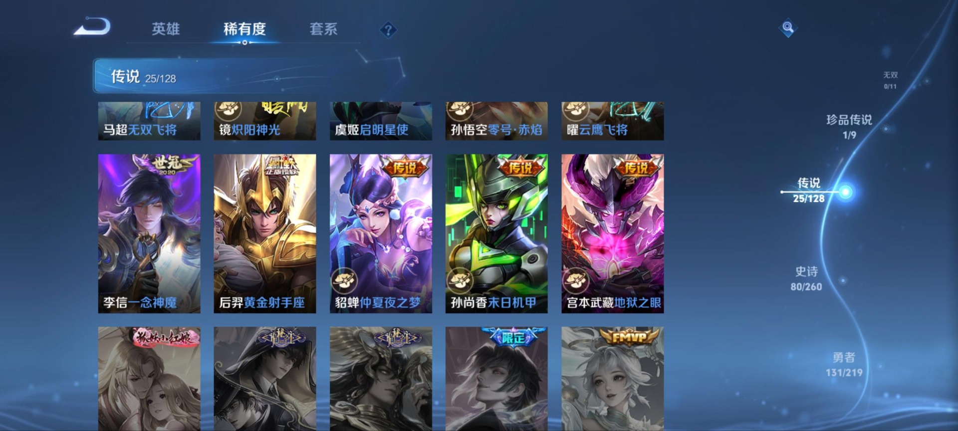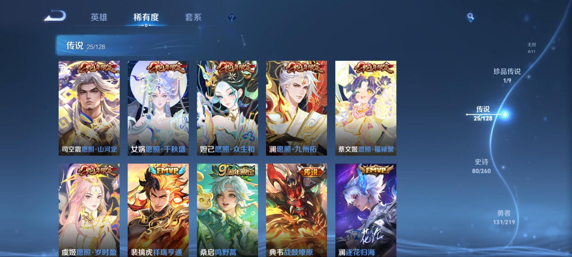 司空震愿照·山河定,裴擒虎李小龙,李白诗剑行,艾琳陌上桑,马可波罗深海之息,桑启鸣野蒿,女娲愿照·千秋盛,孙悟空孙行者,孙悟空至尊宝,妲己愿照·众生和,韩信傲雪梅枪,蔡文姬愿照·福禄聚,澜愿照·九州拓,虞姬愿照·岁时盈