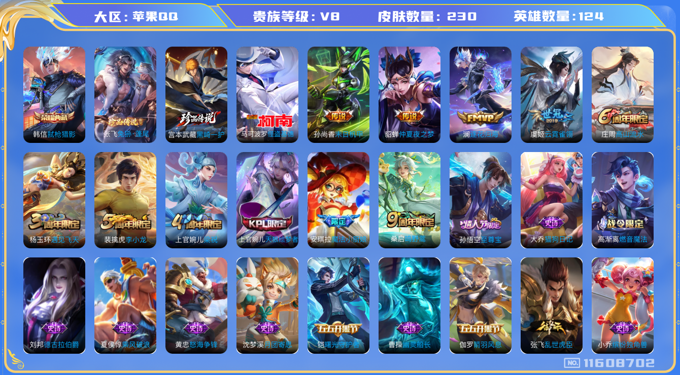 [11608702]V8 1典藏 3珍品传说 6传说 124英雄 230皮肤 可修改实名 优质装备:弑枪猎影(韩信典藏),怪盗基德,黑崎一护,云霓雀翎,末日机甲-孙尚香(绿蚂蚱),仲夏夜之梦(大飞蛾),澜逐花归海 珍品传说:兔狲·蓬尾 珍宝阁皮:优雅恋人 限定皮:鸣野蒿,至尊宝,魔法小厨娘,遇见飞天,高山流水,梁祝,天狼绘梦者,李小龙 史诗皮:赞萌露比,鸭鸭历险记-刘禅,龙之律动,石田雨龙,怒海争锋,破空之剑,蒙犽顽岩魄,蔬乡物语(鲁班七号),百相守梦-百里守约,遇见神鹿,紫霞仙子,苍穹之光,电玩小子(小书包),白龙吟,黄金分割率,特工魅影,千年之狐,江河有灵,魅语,百解令(蒙犽),高渐离燃音魔法,冰冠公主,青蛇,偶像歌手,龙骑士(小龙虾),末日机甲-吕布,猫狗日记-孙策,猫狗日记-大乔,乱世虎臣,女仆咖啡,摇滚巨星,水果甜心,天才门将,星夜王子,功夫厨神,德古拉伯爵,暗隐猎兽者,幽灵船长,鬼剑武藏,暗渊魔法,心灵战警,天秀·启明,舞动绿茵,纤云弄巧,繁星吟游(呼啦呼啦),拒霜思,缤纷独角兽,乘风破浪,逐浪之夏,月团寄思,水晶猎龙者,曙光守护者,箭羽风息,圣诞狂欢,圣诞恋歌,鹰眼统帅,魅力维加斯,未来纪元-赵云