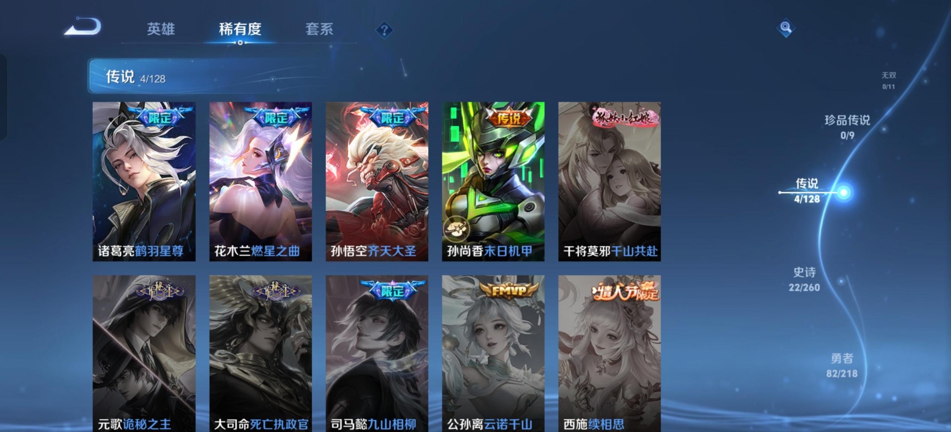 - [11350038]V6 4传说 124英雄 184皮肤 可修改实名 优质装备:黄金白羊座,久胜战神 传说皮:幻光神枪 珍宝阁皮:优雅恋人,玩趣恶龙 限定皮:鸣野蒿,至尊宝,高山流水,五谷丰年,梁祝,天狼征服者,李小龙,朱雀志(守约年限),大圣娶亲 史诗皮:鸭鸭历险记-刘禅,化蝶舞,星界战将,龙之律动,石田雨龙,蔬乡物语(鲁班七号),百相守梦-黄忠,黄金分割率,特工魅影,末日机甲-吕布,时之恋人-孙尚香,摇滚巨星,水果甜心,星夜王子,功夫厨神,暗隐猎兽者,鬼剑武藏,心灵战警,舞动绿茵,繁星吟游(呼啦呼啦),乘风破浪,逐浪之夏,箭羽风息,金属风暴,圣诞狂欢,圣诞恋歌,鹰眼统帅,赏金猎手,未来纪元-赵云