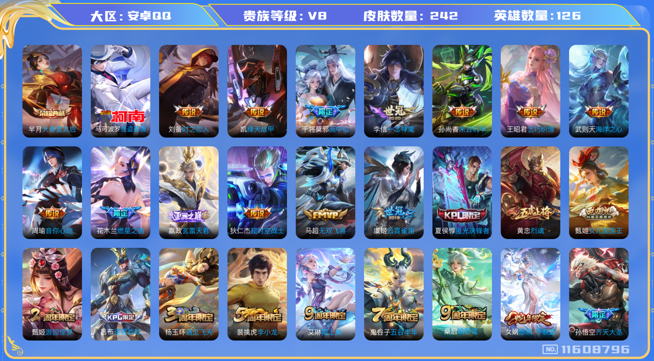 [11608796]V8 1典藏 1珍品传说 18传说 126英雄 242皮肤 典藏英雄武则天 可修改实名 优质装备:大秦宣太后,怪盗基德,绛天战甲(鸡嘴战神),一念神魔,云霓雀翎,末日机甲-孙尚香(绿蚂蚱),海洋之心,音你心动-周瑜,乞巧织情,时之恋人-刘备(电焊工),超时空战士-狄仁杰,无双飞将,燃星之曲,画中仙,玄雷天君 珍宝阁皮:妄想食味,胡桃夹子 限定皮:愿照·千秋盛(女娲年限),逐霄战戟,映山客,陌上桑,鸣野蒿,傲雪梅枪,遇见飞天,齐天大圣,匿光决锋者,五谷丰年,游园惊梦,烈魂,李小龙,朱雀志(守约年限),女儿国国王 史诗皮:赞萌露比,撼地雄心,破空之剑,百相守梦-百里守约,遇见神鹿,紫霞仙子,电玩小子(小书包),特工魅影,浮梦罗烟,魅语,无限星赏官,冰冠公主,青蛇,偶像歌手,晚萤,暗夜猫娘,百相守梦(关羽),猫狗日记-孙策,猫狗日记-大乔,时之恋人-孙尚香,节奏热浪,修罗,女仆咖啡,摇滚巨星,水果甜心,天才门将,星夜王子,心灵骇客,功夫厨神,德古拉伯爵,暗隐猎兽者,幽灵船长,鬼剑武藏,心灵战警,地狱岩魂,纤云弄巧,缤纷独角兽,乘风破浪,逐浪之夏,龙鼓争鸣,月团寄思,热力回旋,箭羽风息,唤灵魅影,金属风暴,圣诞狂欢,鹰眼统帅,王者之锤,暗夜贵公子,魅力维加斯,黎明之约,奇遇舞章,天秀·音浪,无心,未来纪元-赵云,玫瑰异探