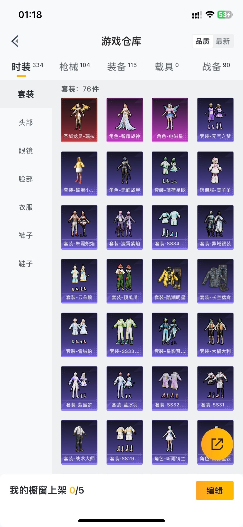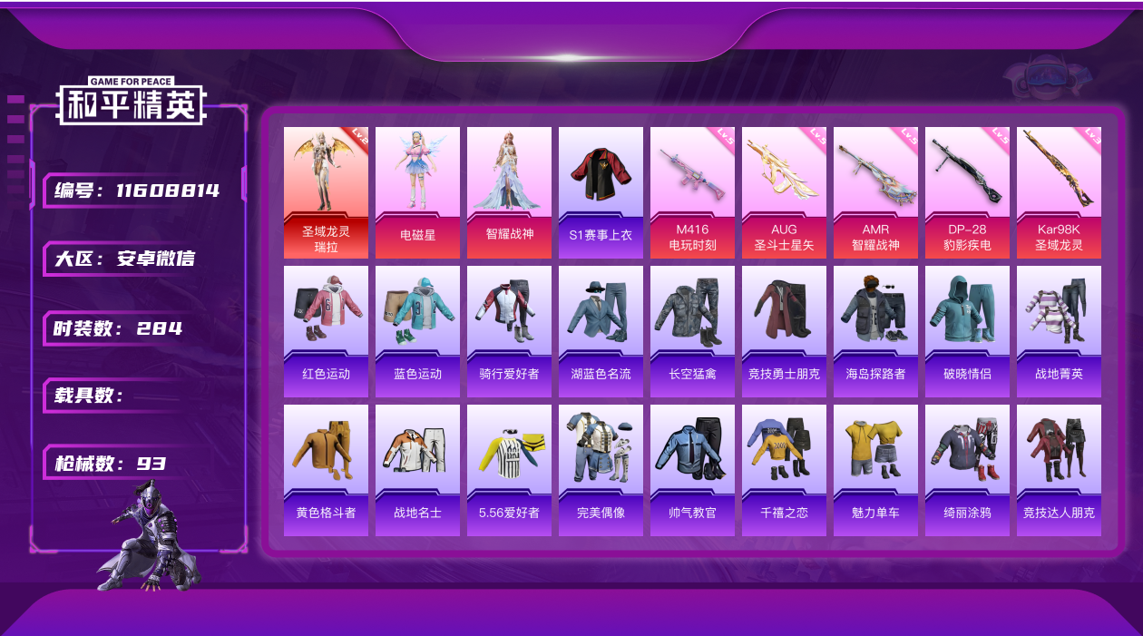 [11608814]1红装 2粉装 5特效枪 5印记 可二次 可修改实名 优质装备:圣域龙灵-瑞拉,二级圣域龙灵-瑞拉(2级瑞拉),M416电玩时刻,Kar98K-圣域龙灵,智耀战神,AMR-智耀战神,AUG-圣斗士星矢 热门装扮:电磁星,S1赛事上衣 稀有枪皮:DP-28-豹影疾电 五级特效枪:五级DP-28-豹影疾电,五级AMR-智耀战神,五级AUG-圣斗士星矢,五级M416-电玩时刻 三级特效枪:三级Kar98K-圣域龙灵 紫色装扮:SS31特训套装,SS2特训,SS3特训,S4赛事,北国孤狼,千禧之恋,云朵鹅,雪绒豹,SS33特训套装,顶瓜瓜,5.56爱好者,潮流游乐家,瑞龙福将,团圆交子,醒狮腾龙,SS17特训,都市魅力,酷潮明星,长空猛禽,霓虹街区,缤纷果语,蓝色运动,跃动心情,无面战甲,骑行爱好者,魅力单车,黄色格斗者,龟仙人,格斗先锋,海岛探路者,完美偶像,帅气教官,战地名士,战地菁英,湖蓝色名流,绮丽涂鸦,破晓情侣,破蛋小黄鸡,碟中谍A款,福星高照,空岛之星,竞技勇士朋克,竞技达人朋克,红色运动,牛气满满,SS29特训,白光莹,纯真浪花,热情海星,SS28特训,听雨铃兰,粉雾星云,异域银装,湖雨初晴,焰鹰斗篷,幻羽潜行,SS27特训,童真绒兔,大橘大利,星影赞美诗,SS9特训,耀粉歌者,蓝冰羽,紫幽梦,SS32特训服(SS32特训套装) 优质战备:龙翔九天飞行器,精灵梦叶罗丽降落伞,巴啦啦小魔仙降落伞,江南烟雨降落伞,星之彼岸降落伞,镜域双华降落伞,镜域双华-灵镜之阶,冷漠罗丽降落伞,智耀战神降落伞,圣域龙灵降落伞,圣域金龙飞行器,飞行器-齐天大圣