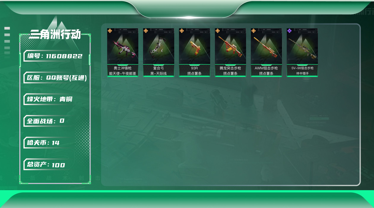 [11608822]总资产:100.8M 5传说枪械 哈夫币:14.927K 进阶安全箱(9.17到期) 可二次 可修改实名 烽火地带段位:青铜 全面战场段位:无段位 传说武器皮肤:93R-捞点薯条,AWM狙击步枪-捞点薯条,腾龙突击步枪-捞点薯条,勇士冲锋枪-能天使-午夜邮差,复合弓-黑-天际线 史诗武器皮肤:SV-98狙击步枪-林中猎手