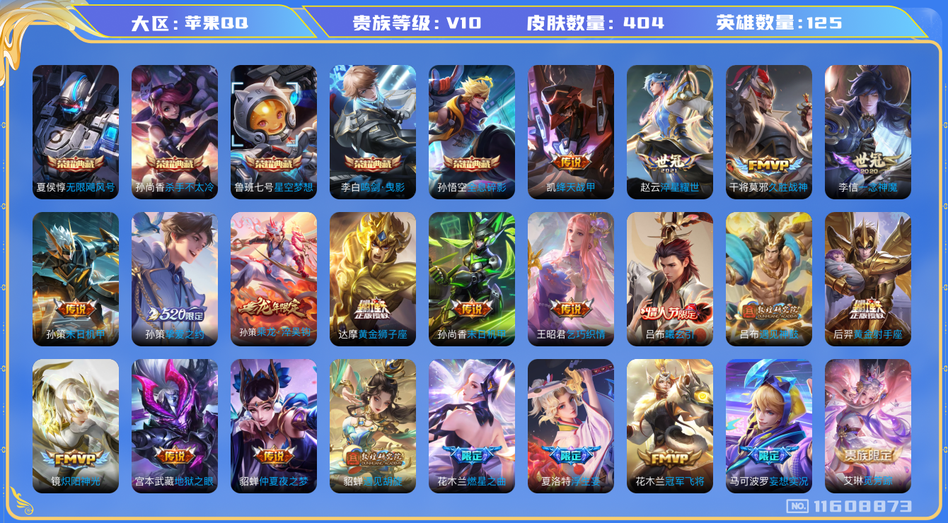 [11608873]V10 5典藏 32传说 125英雄 404皮肤 可修改实名 优质装备:星空梦想(太空人),无限飓风号(高达),杀手不太冷,鸣剑·曳影,全息碎影(猴子典藏),黄金狮子座,黄金射手座,冠军飞将,云鹰飞将(小将军),绛天战甲(鸡嘴战神),久胜战神,炽阳神光,一念神魔,末日机甲-孙尚香(绿蚂蚱),地狱火,仲夏夜之梦(大飞蛾),地狱之眼,乞巧织情,淬星耀世,遇见胡旋,末日机甲-孙策,挚爱之约,无双飞将,碎云,燃星之曲,浮生妄,妄想实况,遇见神鼓,艾琳觅芳踪 传说皮:乘龙·淬吴钩(孙策年限),吕布曦玄引 珍宝阁皮:妄想食味,优雅恋人,蔷薇恋人 限定皮:逐霄战戟,鸣野蒿,至尊宝,傲雪梅枪,绯月行,时之彼端,神威(电光马子),飞衡(韩信年限),遇见飞天,高山流水,诗剑行,怒海麟威,降魔,五谷丰年,冰锋战神,游园惊梦,梁祝,御风骁将(吕布年限),烈魂,天狼绘梦者,李小龙,逐梦之影,朱雀志(守约年限),如梦令-后羿,霸王别姬-虞姬,圣诞老人,真爱至上,孙行者,猪悟能,大圣娶亲,天魔缭乱,天降福星,山海·玄木吟(马可年限) 史诗皮:鸭鸭历险记-刘禅,灵蛊蚀心,星界战将,石田雨龙,琥珀纪元伽罗,百相守梦-黄忠,紫霞仙子,苍穹之光,电玩小子(小书包),白龙吟,黄金分割率,特工魅影,千年之狐,永昼,江河有灵,匿光侦查者,魅语,高渐离燃音魔法,蒙恬荣光圣徽,冰冠公主,偶像歌手,晚萤,电玩·爆裂旋风,暗夜猫娘,龙骑士(小龙虾),末日机甲-吕布,猫狗日记-孙策,猫狗日记-大乔,乱世虎臣,节奏热浪,修罗,女仆咖啡,摇滚巨星,水果甜心,绅士熊喵,天才门将,星夜王子,心灵骇客,功夫厨神,德古拉伯爵,暗隐猎兽者,幽灵船长,鬼剑武藏,心灵战警,天秀·启明,舞动绿茵,地狱岩魂,纤云弄巧,繁星吟游(呼啦呼啦),拒霜思,缤纷独角兽,乘风破浪,逐浪之夏,水晶猎龙者,曙光守护者,箭羽风息,金属风暴,原初追逐者,圣诞狂欢,圣诞恋歌,鹰眼统帅,王者之锤,暗夜贵公子,魅力维加斯,黎明之约,雪上飞焰,赏金猎手,无心,未来纪元-赵云