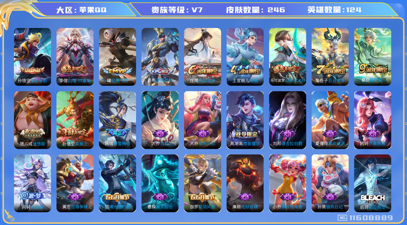 [11608889]V7 1典藏 3传说 124英雄 246皮肤 可修改实名 优质装备:全息碎影(猴子典藏),云鹰飞将(小将军),山海·炽霜斩(李信年限) 珍宝阁皮:妄想食味,玩趣恶龙 限定皮:逐霄战戟,鸣野蒿,傲雪梅枪,高山流水,五谷丰年,梁祝,猪悟能,美猴王,山海·玄木吟(马可年限) 史诗皮:化蝶舞,星界战将,龙之律动,石田雨龙,怒海争锋,破空之剑,蔬乡物语(鲁班七号),百相守梦-百里守约,电玩小子(小书包),黄金分割率,特工魅影,千年之狐,江河有灵,真我赫兹(百里守约),百解令(蒙犽),高渐离燃音魔法,蒙恬荣光圣徽,偶像歌手,白蛇,电玩·爆裂旋风,末日机甲-吕布,猫狗日记-孙策,猫狗日记-大乔,节奏热浪,修罗,女仆咖啡,水果甜心,绅士熊喵,星夜王子,德古拉伯爵,暗隐猎兽者,幽灵船长,鬼剑武藏,心灵战警,舞动绿茵,地狱岩魂,拒霜思,缤纷独角兽,乘风破浪,水晶猎龙者,曙光守护者,箭羽风息,金属风暴,原初追逐者,圣诞狂欢,圣诞恋歌,鹰眼统帅,魅力维加斯,黎明之约,无心,未来纪元-赵云