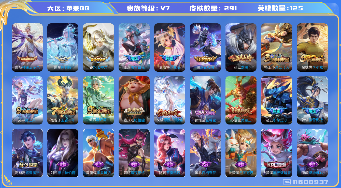 [11608937]V7 1典藏 7传说 125英雄 291皮肤 可修改实名 优质装备:神鉴启示录,炽阳神光,浮生妄,霜月吟,澜逐花归海 传说皮:落雪白狼 珍宝阁皮:妄想食味,优雅恋人,蔷薇恋人 限定皮:愿照·千秋盛(女娲年限),陌上桑,鸣野蒿,至尊宝,傲雪梅枪,遇见飞天,五谷丰年,龙胆,李小龙,猪悟能,引擎之心,美猴王 史诗皮:器灵·浮梦炉,星界战将,撼地雄心,破空之剑,战舞者,东方月初,埋骨钱,芈月浮光幕影,决胜骁骑,蔬乡物语(鲁班七号),百相守梦-百里守约,百相守梦-黄忠,特工魅影,千年之狐,江河有灵,匿光侦查者,鹤归松栖(赵怀真),雪夜绮愿(周瑜),真我赫兹(镜),百解令(蒙犽),高渐离燃音魔法,蒙恬荣光圣徽,匿光破解者,偶像歌手,暗夜猫娘,末日机甲-吕布,猫狗日记-孙策,节奏热浪,修罗,女仆咖啡,摇滚巨星,水果甜心,天才门将,星夜王子,心灵骇客,德古拉伯爵,暗隐猎兽者,鬼剑武藏,天秀·启明,纤云弄巧,拒霜思,缤纷独角兽,乘风破浪,逐浪之夏,月团寄思,水晶猎龙者,金属风暴,原初追逐者,圣诞狂欢,鹰眼统帅,魅力维加斯,赏金猎手,无心,未来纪元-赵云