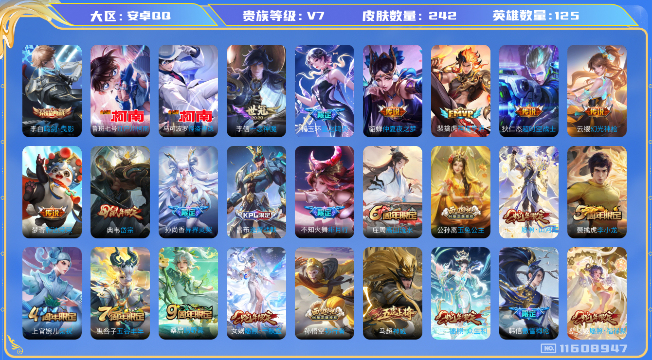 [11608947]V7 1典藏 2珍品传说 16传说 125英雄 242皮肤 可修改实名 优质装备:鸣剑·曳影,江户川柯南,怪盗基德,一念神魔,仲夏夜之梦(大飞蛾),胖达荣荣,超时空战士-狄仁杰 传说皮:星之鸣奏,祥瑞亨通,幻光神枪 珍宝阁皮:妄想食味,蔷薇恋人 限定皮:愿照·九州拓(澜年限),愿照·福禄聚(蔡文姬年限),愿照·岁时盈(虞姬年限),愿照·山河定(司空震年限),愿照·众生和(妲己年限),愿照·千秋盛(女娲年限),逐霄战戟,鸣野蒿,异界灵契(白毛香),傲雪梅枪,绯月行,神威(电光马子),高山流水,五谷丰年,梁祝,岱宗(典韦年限),李小龙,孙行者,玉兔公主 史诗皮:狼魂孤将,化蝶舞,星界战将,茶境仙,破空之剑,芈月浮光幕影,琥珀纪元伽罗,上官婉儿群星魔术团,百相守梦-百里守约,紫霞仙子,千年之狐,江河有灵,百解令(蒙犽),高渐离燃音魔法,冰冠公主,暗夜猫娘,猫狗日记-孙策,乱世虎臣,修罗,女仆咖啡,水果甜心,天才门将,星夜王子,心灵骇客,时之奇旅-安琪拉,暗隐猎兽者,幽灵船长,鬼剑武藏,乐园奇幻夜,舞动绿茵,纤云弄巧,繁星吟游(呼啦呼啦),拒霜思,乘风破浪,逐浪之夏,水晶猎龙者,金属风暴,原初追逐者,圣诞狂欢,圣诞恋歌,鹰眼统帅,魅力维加斯,未来纪元-赵云