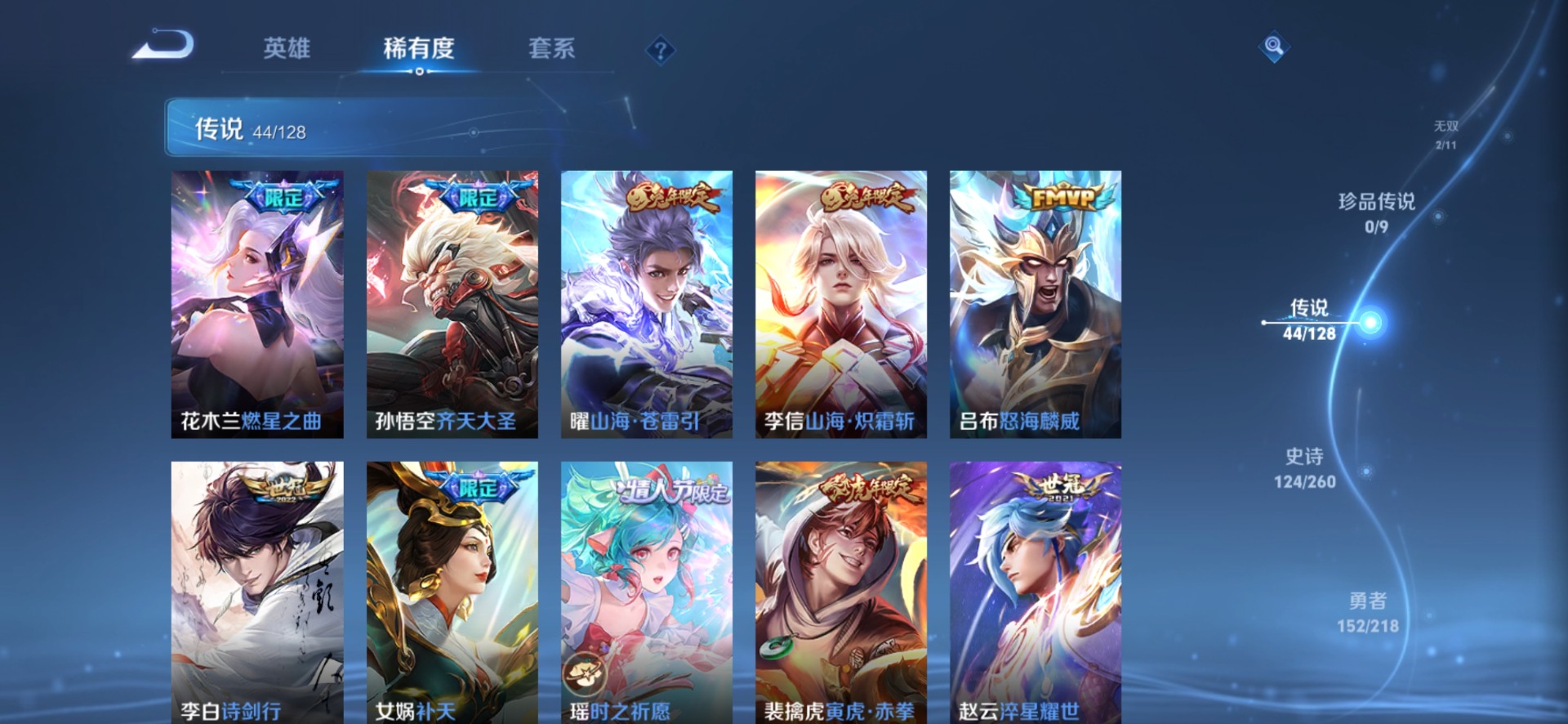 - [11824055]V8 1典藏 1珍品传说 20传说 125英雄 325皮肤 可修改实名 优质装备:最初的交响(伽罗典藏),云霓雀翎,末日机甲-孙尚香(绿蚂蚱),仲夏夜之梦(大飞蛾),乞巧织情,超时空战士-狄仁杰,鹤羽星尊,妄想实况,牧神诗旅 珍品传说:兔狲·蓬尾 传说皮:祥瑞亨通,幻光神枪 珍宝阁皮:万物之道,蔷薇恋人,玩趣恶龙 限定皮:愿照·九州拓(澜年限),愿照·福禄聚(蔡文姬年限),愿照·岁时盈(虞姬年限),愿照·山河定(司空震年限),愿照·众生和(妲己年限),愿照·千秋盛(女娲年限),鸣野蒿,至尊宝,遇见飞天,怒海麟威,五谷丰年,祈雪灵祝(雪兔子),李小龙,引擎之心,山海·玄木吟(马可年限) 史诗皮:鸭鸭历险记-刘禅,器灵·浮梦炉,绮世丹青,化蝶舞,星界战将,灵蛊蚀心,龙之律动,雪豹·霜爪,藏狐·褐绒,石田雨龙,百相守梦-周瑜,茶境仙,破空之剑,蒙犽顽岩魄,蔬乡物语(鲁班七号),琥珀纪元伽罗,百相守梦-百里守约,百相守梦-黄忠,遇见神鹿,紫霞仙子,苍穹之光,黄金分割率,特工魅影,江河有灵,雪夜绮愿(周瑜),百解令(蒙犽),高渐离燃音魔法,蒙恬荣光圣徽,龙骑士(小龙虾),魅语,冰冠公主,猫狗日记-孙策,时之恋人-孙尚香,乱世虎臣,节奏热浪,修罗,女仆咖啡,摇滚巨星,水果甜心,绅士熊喵,心灵骇客,功夫厨神,德古拉伯爵,暗隐猎兽者,幽灵船长,鬼剑武藏,心灵战警,天秀·启明,舞动绿茵,地狱岩魂,纤云弄巧,拒霜思,缤纷独角兽,乘风破浪,逐浪之夏,水晶猎龙者,曙光守护者,箭羽风息,金属风暴,原初追逐者,圣诞狂欢,圣诞恋歌,鹰眼统帅,暗夜贵公子,魅力维加斯,滕王阁序,无心,未来纪元-赵云