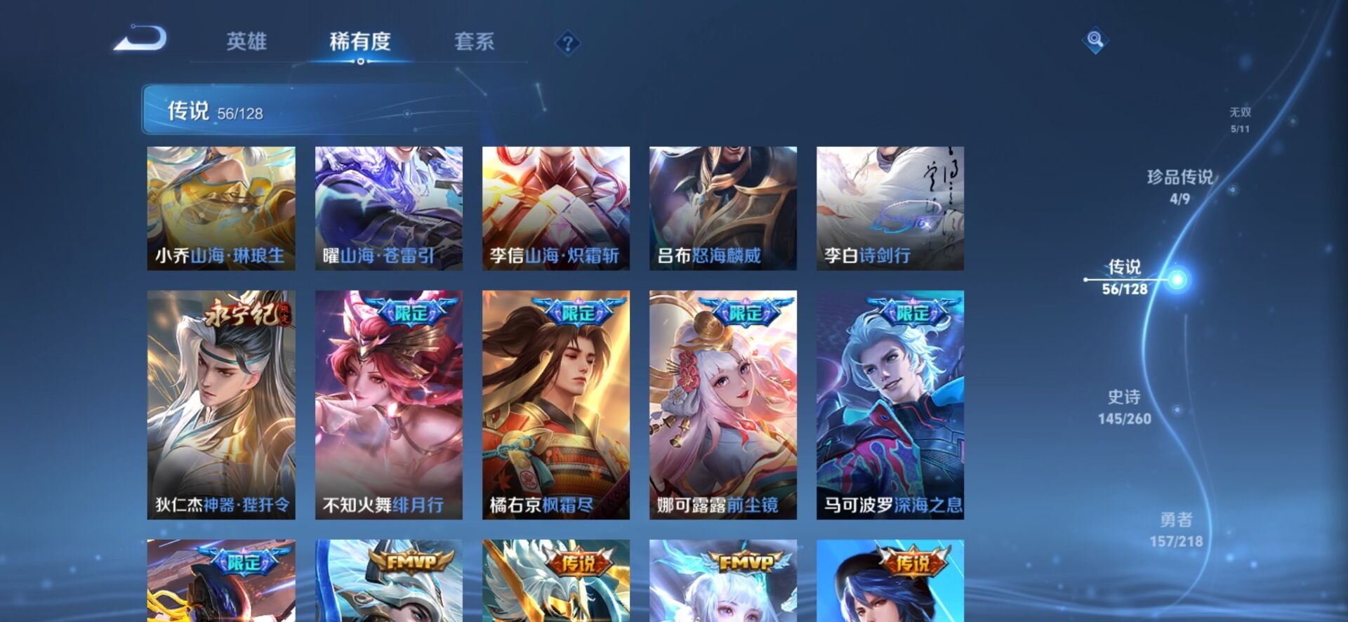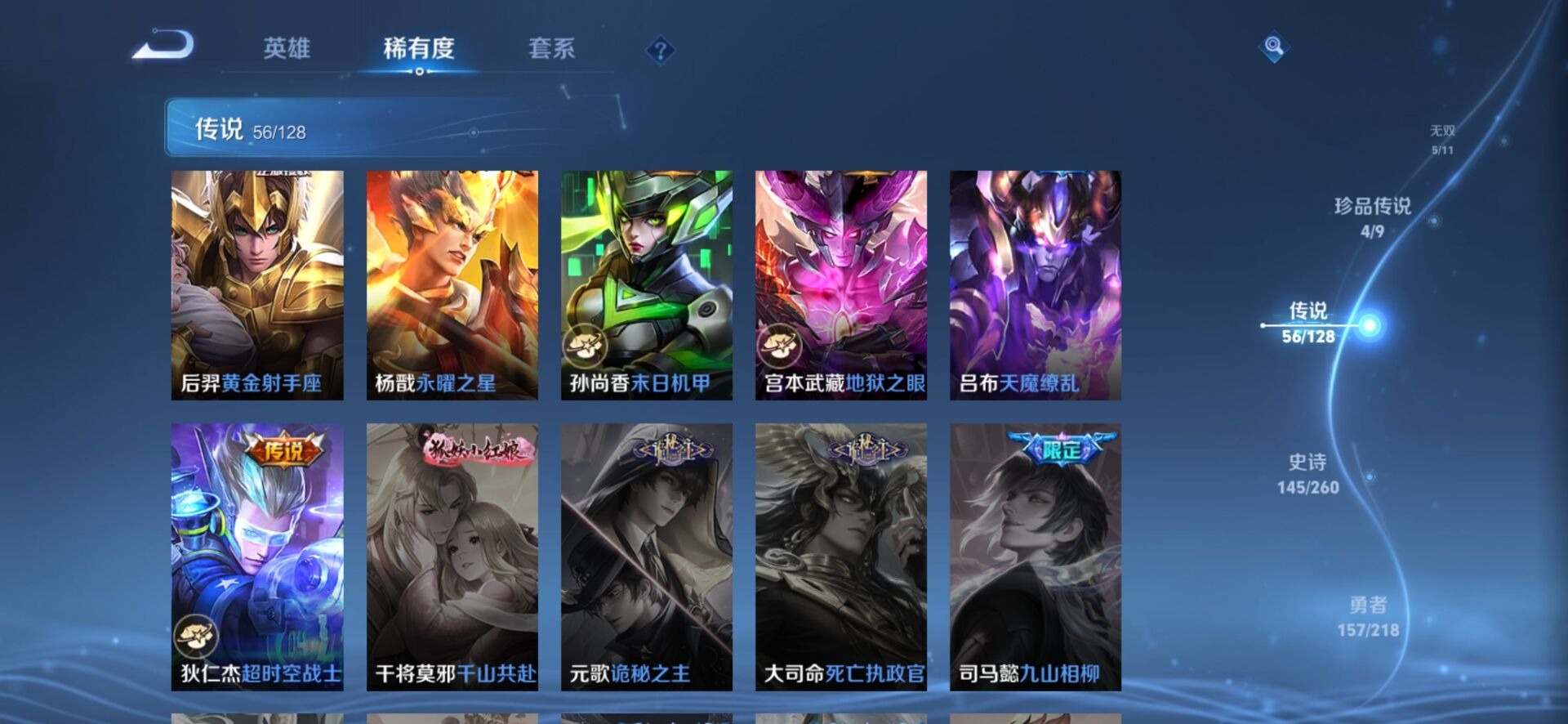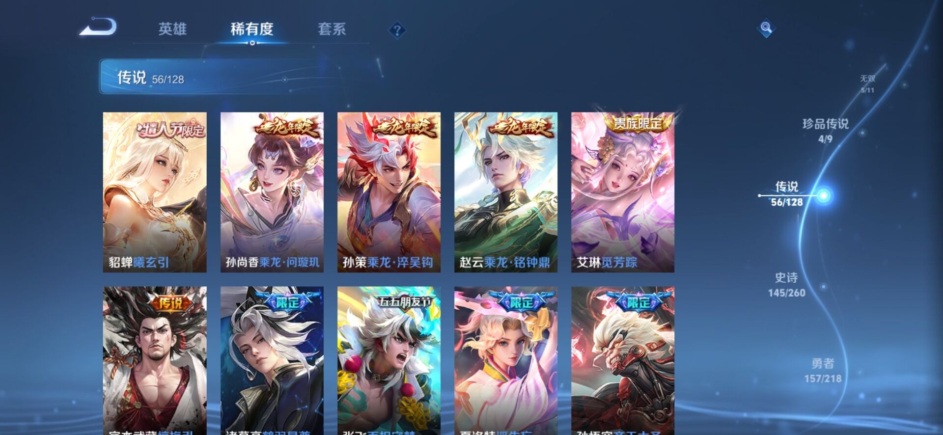 夏侯惇霜北刀,黄忠烈魂,甄姬幽恒,铠青龙志,盾山梦圆繁星,伽罗太华,赵云百木心枪,干将莫邪冰霜恋舞曲,典韦岱宗,不知火舞绯月行,牛魔奔雷神使,项羽霸王别姬,后羿无尽星芒,吕布御风骁将,后羿如梦令,后羿辉光之辰,庄周玄嵩,诸葛亮时雨天司,公孙离祈雪灵祝,司空震愿照·山河定,裴擒虎李小龙,上官婉儿梁祝,李白诗剑行,安琪拉魔法小厨娘,马可波罗山海·玄木吟,马可波罗深海之息,桑启鸣野蒿,女娲愿照·千秋盛,芈月白晶晶,孙悟空至尊宝,百里玄策白虎志,赵云引擎之心,妲己愿照·众生和,百里守约朱雀志,蔡文姬愿照·福禄聚,瑶山海·碧波行,澜愿照·九州拓,虞姬霸王别姬,虞姬愿照·岁时盈,娜可露露前尘镜,王昭君凤凰于飞,嫦娥如梦令,橘右京枫霜尽