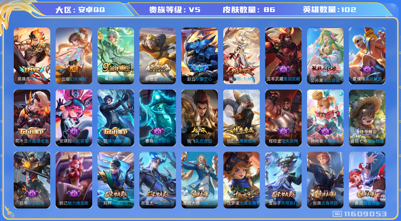[11609053]V5 4传说 102英雄 86皮肤 可修改实名 优质装备:涂山容容 传说皮:祥瑞亨通,幻光神枪 限定皮:愿照·九州拓(澜年限),鸣野蒿,孙行者,引擎之心 史诗皮:蔬乡物语(鲁班七号),末日机甲-吕布,乱世虎臣,水果甜心,心灵骇客,功夫厨神,幽灵船长,鬼剑武藏,乘风破浪,水晶猎龙者,曙光守护者,鹰眼统帅,魅力维加斯