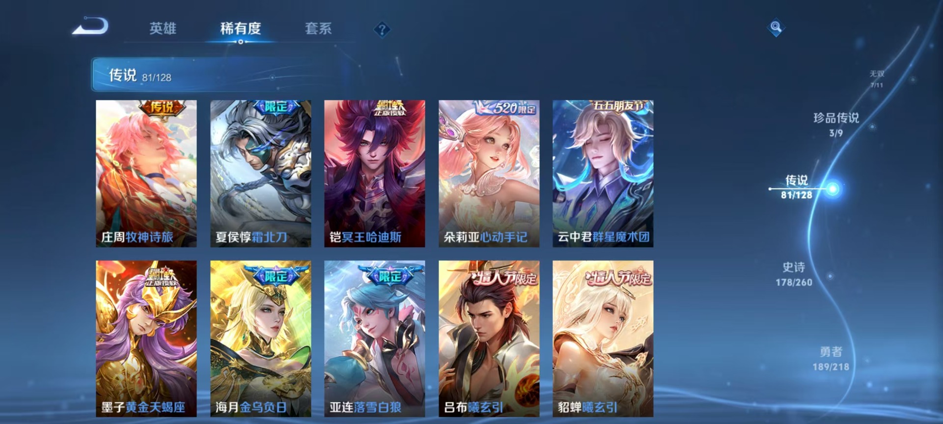 - [11884055]V8 1典藏 22传说 125英雄 117皮肤 可修改实名 优质装备:星空梦想(太空人),黄金射手座,绛天战甲(鸡嘴战神),黄金白羊座,一念神魔,云霓雀翎,地狱火,地狱之眼,乞巧织情,淬星耀世,超时空战士-狄仁杰,无双飞将,音你闪耀(rap皮),记忆之芯(机甲兔),妄想实况,惊梅引,小动物乐团,霜月吟,玄雷天君,涂山容容 传说皮:典韦战鼓燎原 限定皮:映山客,诗剑行 史诗皮:鸭鸭历险记-刘禅,龙之律动,战舞者,百相守梦-百里守约,星界特工,白龙吟,特工魅影,永昼,闲日渔趣,冰冠公主,暗夜猫娘,龙骑士(小龙虾),乱世虎臣,女仆咖啡,摇滚巨星,水果甜心,天才门将,时之奇旅-安琪拉,乐园奇幻夜,舞动绿茵,纤云弄巧,逐浪之夏,月团寄思,水晶猎龙者,箭羽风息,圣诞狂欢,鹰眼统帅,魅力维加斯,天秀·音浪